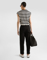 Italy and its beauty are reflected in the Men’s SS25 Collection. Woven raffia and leather give life to jackets, polo-shirts and sweaters to celebrating Italian craftsmanship. The color palette ranges from Nero Sicilia black to burgundy, contributing to conveying a sense of eternal elegance. Refined accessories complement the look: belts and loafers with hand-finished details and oversize bags, such as the Sicily, the Marlene with crocodile-effect print and the versatile Adamo tote. Sleeveless cotton kimono with striped inlay: • Black and White • Regular fit • 18-gauge knit • The piece measures 68 cm from the shoulder seam on a size IT 48 • Made in Italy External composition: 100% Cotton
