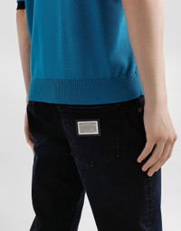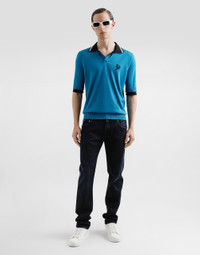 The Italian Holiday Men's Collection revisits 1950s style with a blend of relaxed fits and modern flair. Classic white shirts and tailored suits in refined fabrics contrast with casual denim and playful T-shirts featuring retro graphics with a futuristic twist. Bold prints—chessboards, cats, elegant lighters, and Mediterranean blue ribbons—alongside logo jacquard inspired by ties, infuse a contemporary edge into the essence of Italian holidays. Five-pocket slim-fit jeans in stretch cotton: • Black • Regular fit • Fly-covered zipper and button fastening • Metal Dolce&Gabbana logo tag on the back • The item measures 105 cm on the outer leg and the hem is 16.5 cm wide on a size IT 48 • Made in Italy External composition: 93% Cotton 5% Elastomultiester 2% Spandex