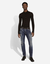 The men's FW 24-25 Re-Edition collection conveys contemporary style that flaunts all the power of the creative DNA that consolidated the brand's image and elevated it to iconic status in the 2000s. Raw-cut details and skilled finishes distinguish pieces with streetwear character: military-inspired jackets and maxi-coats, multi-pocket cargo pants and picot pieces alternate with denim boasting many washes and dyes, thereby redefining an iconic style that is always evolving. Five-pocket slim-fit jeans in stretch denim: • Blue • Regular fit • Fly-covered zipper and button fastening • Dolce&Gabbana logo tag on the back • The item measures 105 cm on the outer leg and the hem is 17 cm wide on a size IT 48 • The model is 185 cm tall and wears a size IT 48 • Made in Italy External composition: 98% Cotton 2% Spandex