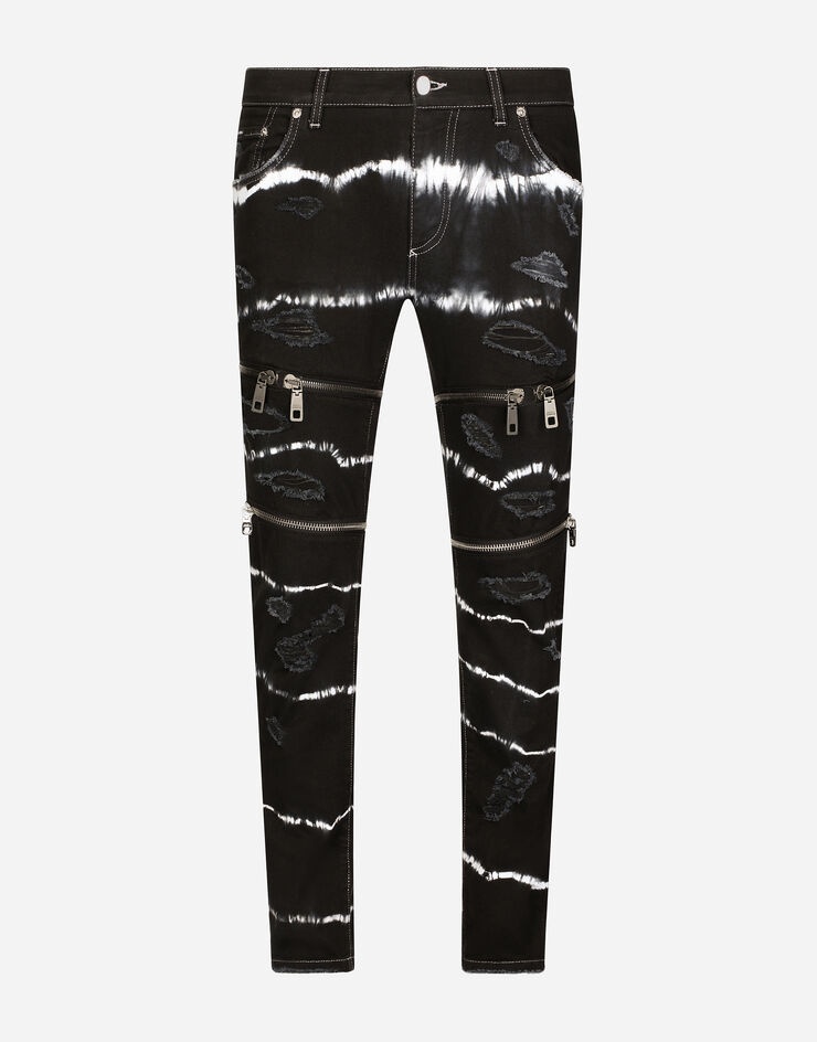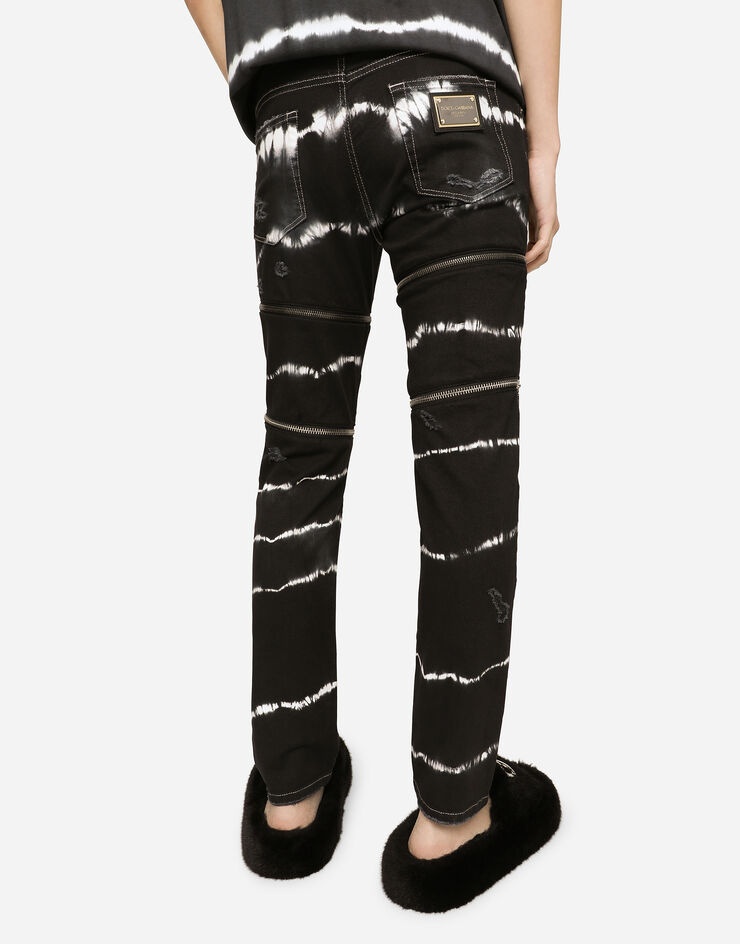 Five-pocket slim-fit jeans in black stretch denim with splash design and zipped details. • Regular fit • Fly-covered zipper and button fastening • Metal Dolce&Gabbana logo tag on the back • The item measures 105 cm on the outer leg and the hem is 17 cm wide on a size IT 48 • The model is 185 cm tall and wears a size IT 48 • Made in Italy Care And Details External composition: 98% Cotton 2% Spandex