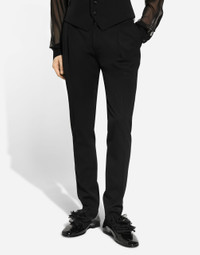 Contemporary men’s formalwear: The FW 24/25 Dolce&Gabbana Men’s Collection is embracing the concept of absolute elegance dominated by the iconic Nero Sicilia black. The daywear of the Dolce&Gabbana man comes to life through the outerwear that comes in a range of lengths and the slim-fit pants. For nightwear, the look becomes scintillating thanks to sequined embellishment and stone appliques. This refined taste can also be seen on the accessories, such as on the slip-ons with hand-applied organza flower accent and the new clutch. Tailored wool gabardine tuxedo pants: • Black • Regular fit • Belt loops on the waist • Contrasting side bands • Fly-covered zipper and button fastening • Front slant pockets and buttoned welt pockets at the back • The item measures 115.5 cm on the outer leg and the hem is 17.5 cm wide on a size IT 48 • Made in Italy External composition: 80% Virgin Wool 16% Silk 4% Polyester