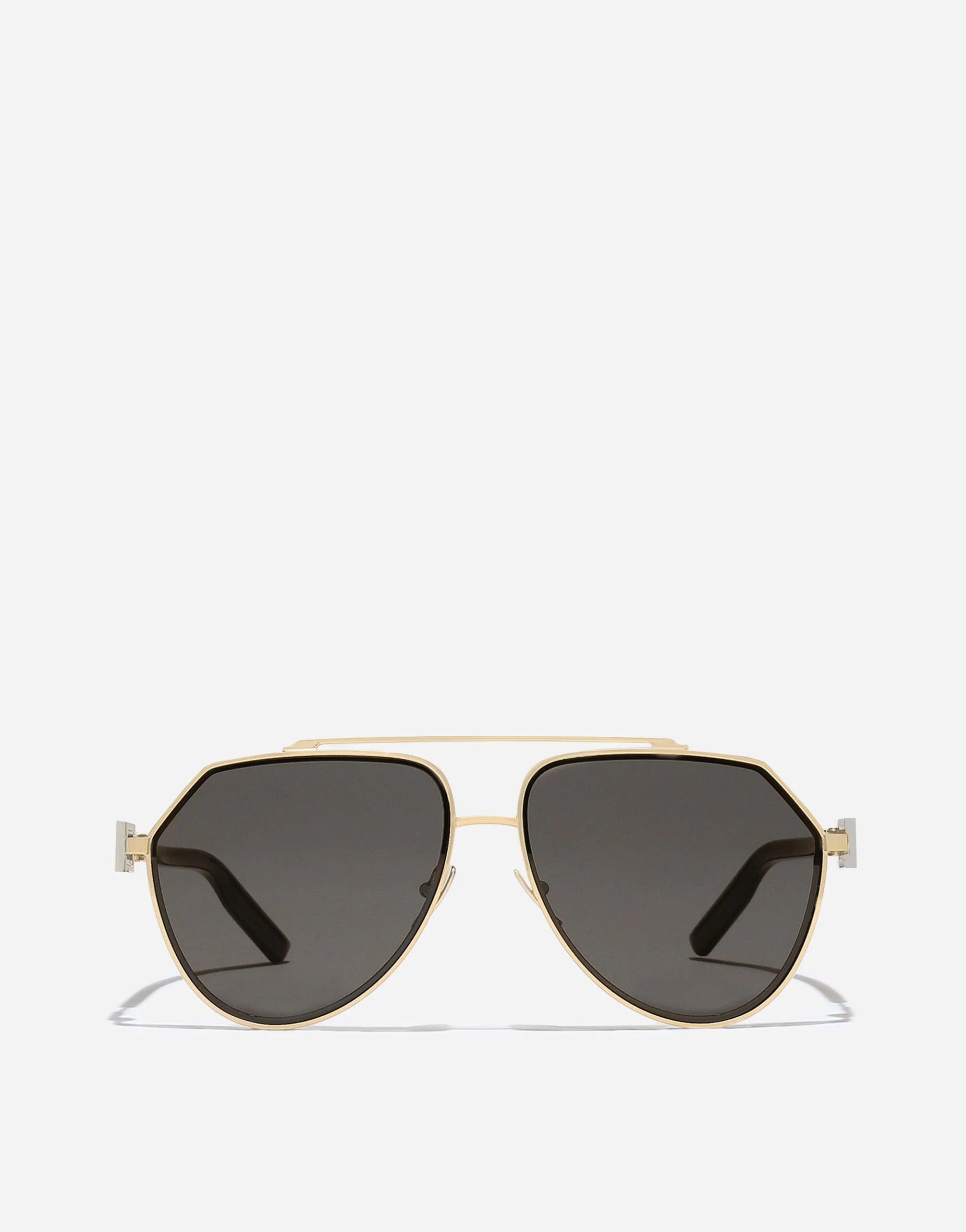 Combo profile pilot model with flat lenses applied on a milled metal structure. The innovative logo plaque hinge embellishes temples while titanium nosepads, giving a touch of elegance to the final look • Gold metal frame • Gold metal temples • Dark Grey lenses • 100% UV protection • Size lens - bridge - temple: 62 - 14 - 145 mm • Fitting: Adjustable nosepads • Packaging: Institutional • Made in Italy