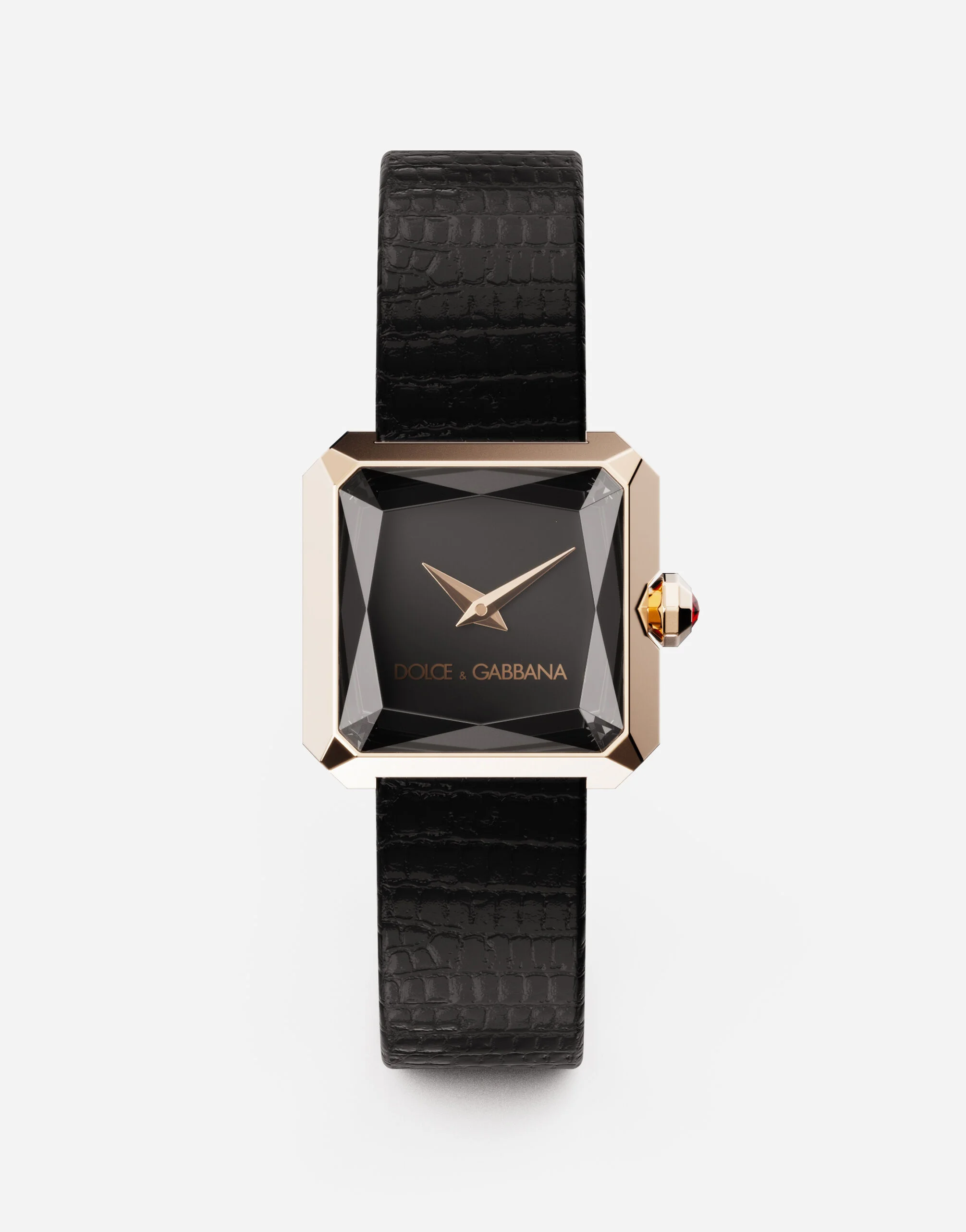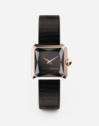 Sofia watch in 18 kt red gold with iguana strap Functions Indication of hours, minutes Movement ETA caliber E01.001 quartz movement Hour and minute hands Case 18 kt red gold case 24x24 mm, opening 18 mm, thickness 8.30 mm. Glass: sapphire glass with geometric faceting Crown: 18kt red gold crown set with a ruby Case back with 4 side screws Waterproof 3 BAR/3 AT M. Dial Black enamelled dial Sword-shaped hands Strap: black lizard Buckle: 18 kt red gold 18 kt red gold POST-SALE WATCH MAINTENANCE To preserve the shine of the watch and metal bracelet, it is recommended to use neutral soap and rinse thoroughly with fresh, lukewarm water. Then dry with a soft cloth. The same procedure is recommended after swimming in the sea or pool. Avoid direct contact with solvents, detergents, perfumes, and cosmetic products, as they may damage the case, seals, bracelet, and/or strap. Protect the watch from drops and impacts, as they could not only seriously damage the finish but also compromise the mechanical functions, water resistance, and accuracy. After adjustments, it is recommended to always push the crown firmly against the case to prevent water or dust from entering the mechanism. The watch is water resistant up to 3 BAR/3 ATM. This means it has been tested under underwater pressure equivalent to a depth of 20 meters. The watch should never be used for sports involving a high risk of impact (such as surfing, water skiing, etc.). Leather straps are not suitable for activities involving water. When the watch is wet, do not pull out the crown, as water could enter the case. Temperatures above 60°C/140°F and below -10°C/14°F , sudden changes in pressure, density and temperature, magnetic fields, and many other factors can affect the accuracy of the watch, we recommended to avoid placing the watch next to objects which could generate strong magnetic fields, such as loudspeakers and electric motors. If you note any irregularities in operation, the watch should be taken to an authorised Dolce&Gabbana retailer.