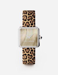 Watch from the SOFIA line Leo printed with waterproof treatment. • Indication of hours and minutes • Material. 316L steel • Size. 24 x 24 mm • Glass. “sapphire” glass with geometrical facets • Bottom clasp. with four side screws and safety closure • Crown. 316L steel set with 1 rose cut black diamond • Gemstones. 57 colourless diamonds 0.38 ct approximately, quality range. colour D-G, clarity VS-SI. • Water resistance . 3BAR/3ATM • Dial. in mother of pearl, without markers with applied logo at 6 o’clock • Hands. pink gold plated, “sword shaped” • Electronic quartz movement powered by a 1.5 V, 3 years life battery . • Calibre. ETA E01.001 Swiss Made • Size. 11 mm diameter, h 2.5 mm • Frequency of the quartz. 32,768 Hz • Number of rubies. 3 • Clasp. 316L steel closure • Swiss made Material: 316L Steel POST-SELLING WATCHES MAINTENANCE To maintain the sheen of the watch and metal bracelet, we recommend using mild soap and rinsing thoroughly with warm water. Dry with a soft cloth. We recommend this being done also after a swim in the sea or pool. It is advisable to avoid direct contact with solvents, detergents, perfumes and cosmetic products, which might damage the case, seals, bracelet and/or strap. It is advisable to protect the watch from falls and shocks, which could not only seriously damage the finish, but might affect the mechanical functions also, as well as the water resistance and accuracy of the watch. Temperatures above 60° C and below -10° C , sudden changes in pressure, density and temperature, magnetic fields, and many other factors can affect the accuracy of the watch. If you note any irregularities in operation, the watch should be taken to an authorised Dolce&Gabbana retailer. The Dolce&Gabbana watch is a high-precision timepiece. Despite the care watchmakers have dedicated to making it, the influence of magnetic fields, sudden temperature change and even the lifestyle of the wearer may result in minor irregularities. To ensure optimal operation, it is recommended that a comprehensive inspection be effected every three or four years. The owners of the watch can benefit from a global network of Dolce&Gabbana retailers, which alone are authorised to carry out operations on the watch. In the same way, for the electronic quartz movement, it is recommended that the battery be replaced by an authorised Dolce&Gabbana retailer, which will at the same time check the proper functioning and water resistance of the watch. During maintenance, the battery and any electrical parts are collected and disposed of in accordance with current regulations.