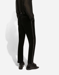 Contemporary men’s formalwear: The FW 24/25 Dolce&Gabbana Men’s Collection is embracing the concept of absolute elegance dominated by the iconic Nero Sicilia black. The daywear of the Dolce&Gabbana man comes to life through the outerwear that comes in a range of lengths and the slim-fit pants. For nightwear, the look becomes scintillating thanks to sequined embellishment and stone appliques. This refined taste can also be seen on the accessories, such as on the slip-ons with hand-applied organza flower accent and the new clutch. Tailored smooth velvet pants: • Black • Regular fit • Belt loops on the waist • Contrasting side bands • Fly-covered zipper and button fastening • Front slant pockets and buttoned welt pockets at the back • The item measures 115.5 cm on the outer leg and the hem is 17.5 cm wide on a size IT 48 • Made in Italy External composition: 70% Cotton 18% Silk 8% Virgin Wool 4% Polyester