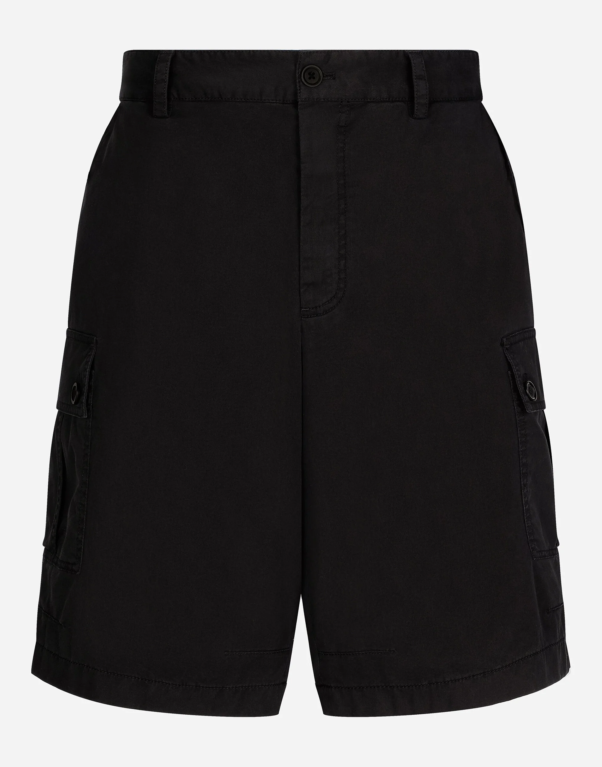 Stretch cotton gabardine Bermuda cargo pants with metal Dolce&Gabbana logo plate: • Black • Regular fit • Belt loops on the waist • Fly-covered zipper and button fastening • Front slant pockets with flap and button and flap pockets with button at the back • Large side pockets • The item measures 55 cm on the outer leg and the hem is 32 cm wide on a size IT 48 • The model is 185 cm tall and wears a size IT 48 • Made in Italy Care And Details External composition: 97% Cotton 3% Spandex