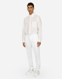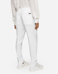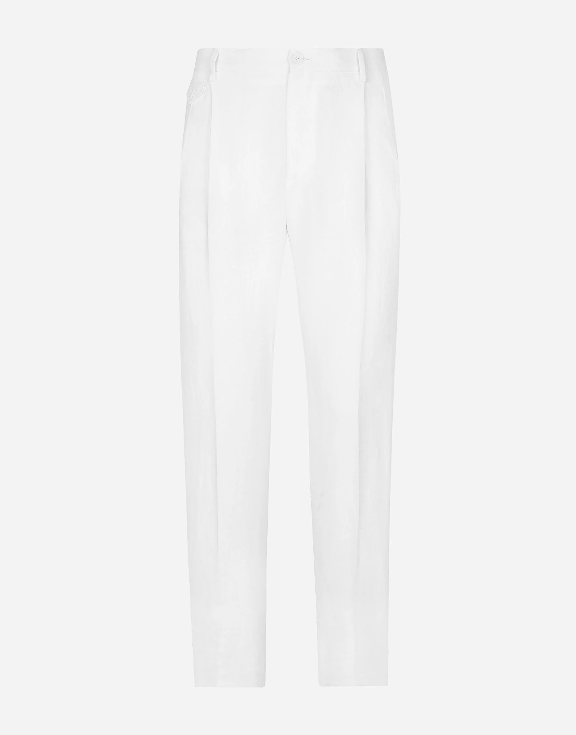 Tailored linen pants with elasticated rear waistband: • White • Regular fit • Belt loops on the waist • Fly-covered zipper and button fastening • Double darts • Front slant pockets, a coin pocket, and buttoned welt pockets on the back • The item measures 99 cm on the outer leg and the hem is 18 cm wide on a size IT 48 • The model is 185 cm tall and wears a size IT 48 • Made in Italy Care And Details External composition: 100% Linen