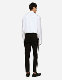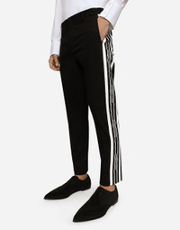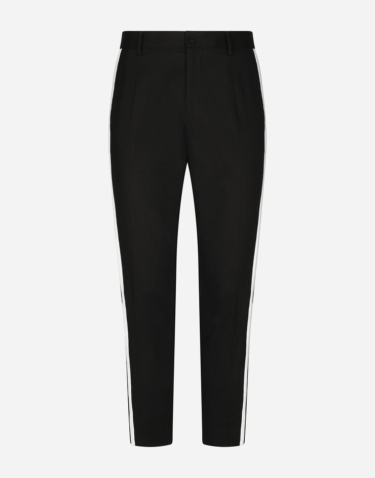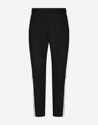 Tailored stretch cotton pants with side bands with Dolce&Gabbana logo: • Regular fit • Belt loops on the waist • Fly-covered zipper and button fastening • Front slant pockets and welt back pockets • The item measures 105.5 cm on the outer leg and the hem is 17 cm wide on a size IT 48 • The model is 185 cm tall and wears a size IT 48 • Made in Italy Care And Details External composition: 95% Cotton 3% Polyamide 2% Spandex