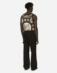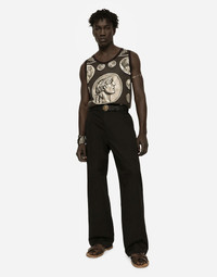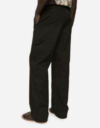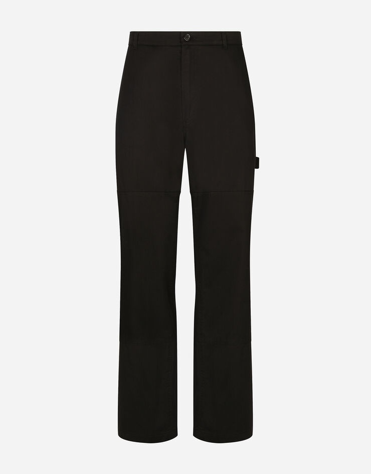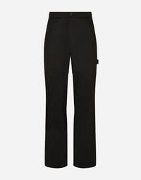 Straight leg worker pants in cotton gabardine with metal Dolce&Gabbana plate: • Black • Regular fit • Belt loops on the waist • Fly-covered zipper and button fastening • Front slant pockets and patch back pockets • Side pockets • The item measures 115 cm on the outer leg and the hem is 26 cm wide on a size IT 48 • The model is 185 cm tall and wears a size IT 48 • Made in Italy Care And Details External composition: 97% Cotton 3% Spandex
