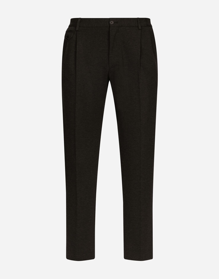 Tailored stretch jersey pinpoint pants with label featuring the Dolce&Gabbana logo: • Gray • Regular fit • Belt loops on the waist • Fly-covered zipper and button fastening • Double darts • Front slant pockets, a coin pocket, and buttoned welt pockets on the back • The item measures 99 cm on the outer leg and the hem is 18 cm wide on a size IT 48 • The model is 185 cm tall and wears a size IT 48 • Made in Italy Care And Details External composition: 64% Viscose 23% Polyamide 8% Polyester 5% Spandex