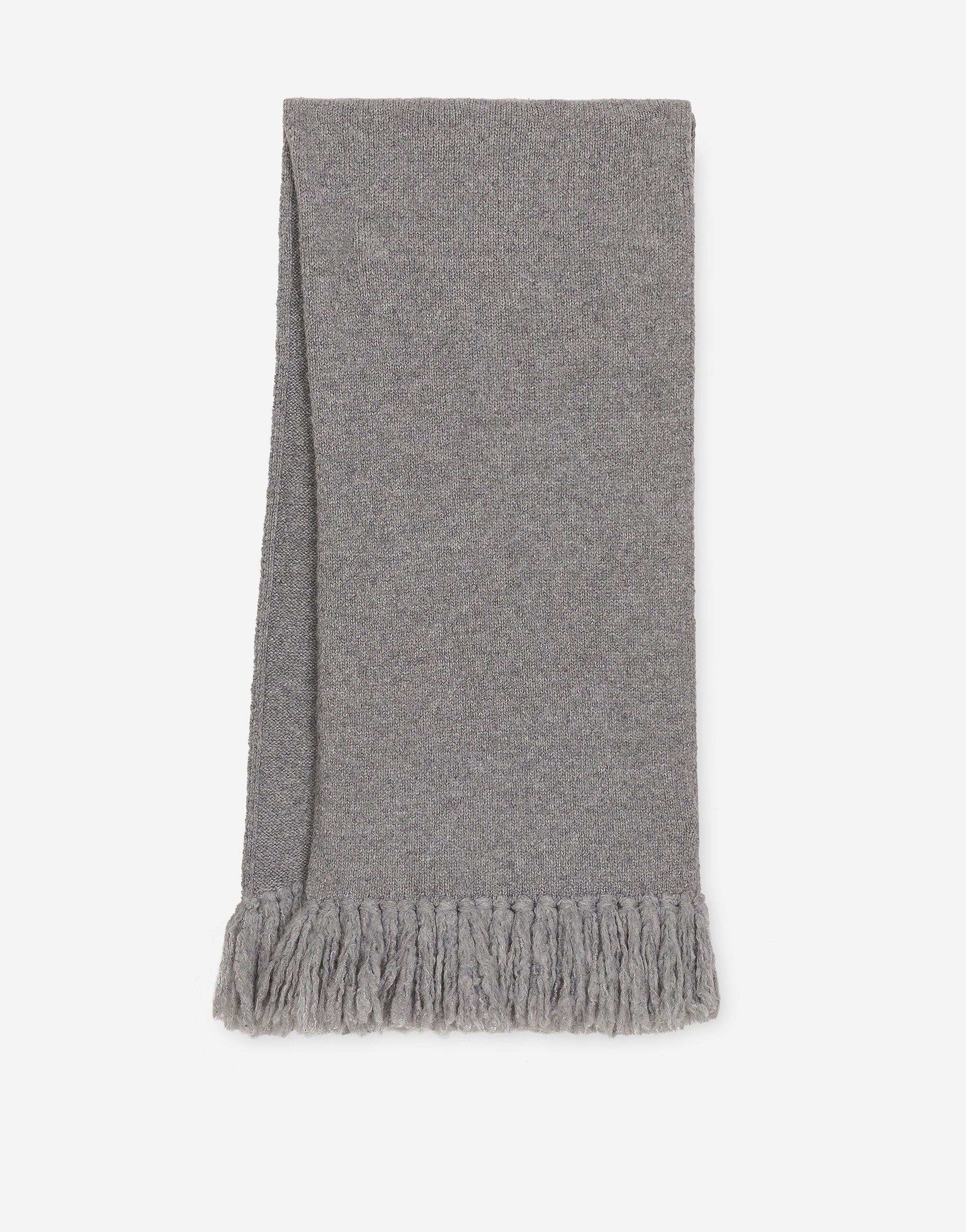 The pieces designed for FW23-24 represent the true essence of Dolce&Gabbana. They dominate with their pure volumes, tailored cut and new proportions. Coats, tops, white shirts, oversize pants, corset girdles and sash-bands that cinch the waist are reissues of the F/W 99-00 collection. Black, the absolute protagonist, which represents elegance, formality and seduction, has been translated into crystal embellishment that brings the wet volcanic stone of Etna and Stromboli to mind. Stretch technical wool knit scarf with fringing: • 5-gauge knit • Measurements: 26 x 220 cm, fringing 12.5 cm • Gray • Made in Italy External composition: 35% Polyamide 32% Wool 32% Viscose 1% Spandex