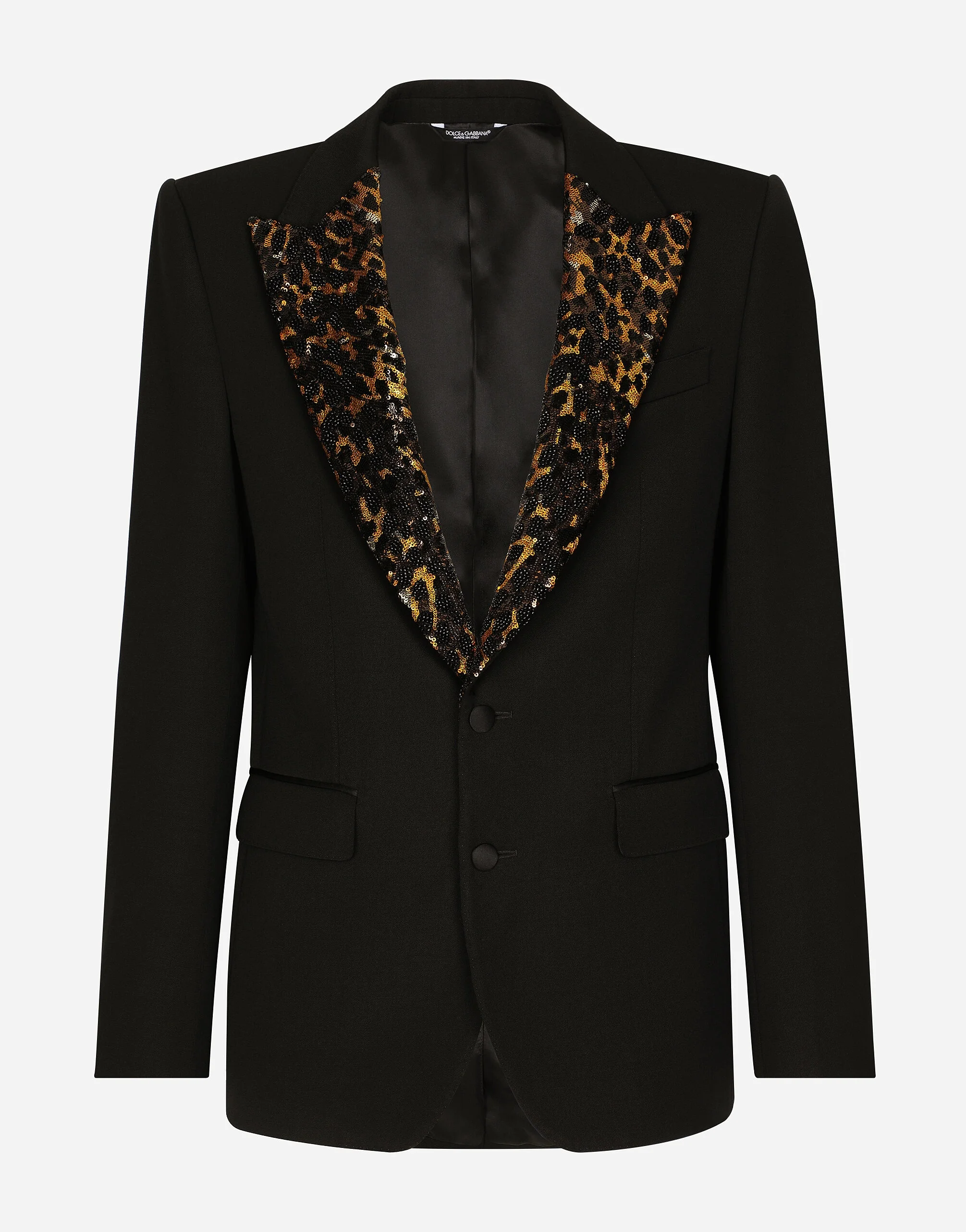 Tailored single-breasted tuxedo jacket in stretch wool with sequined lapels and duchesse details: • Slim Sicilia fit • Peak lapels • Double-button fastening on the front • Outer flap pockets and breast pocket, inner welt pockets with button • Buttoned cuffs • Central vent • Lined • The piece measures 73.5 cm from the rear collar seam on a size IT 48 • The model is 185 cm tall and wears a size IT 48 • Made in Italy Care And Details External composition: 67% Wool 25% Polyester 5% Silk 3% Spandex Internal composition: 100% Silk