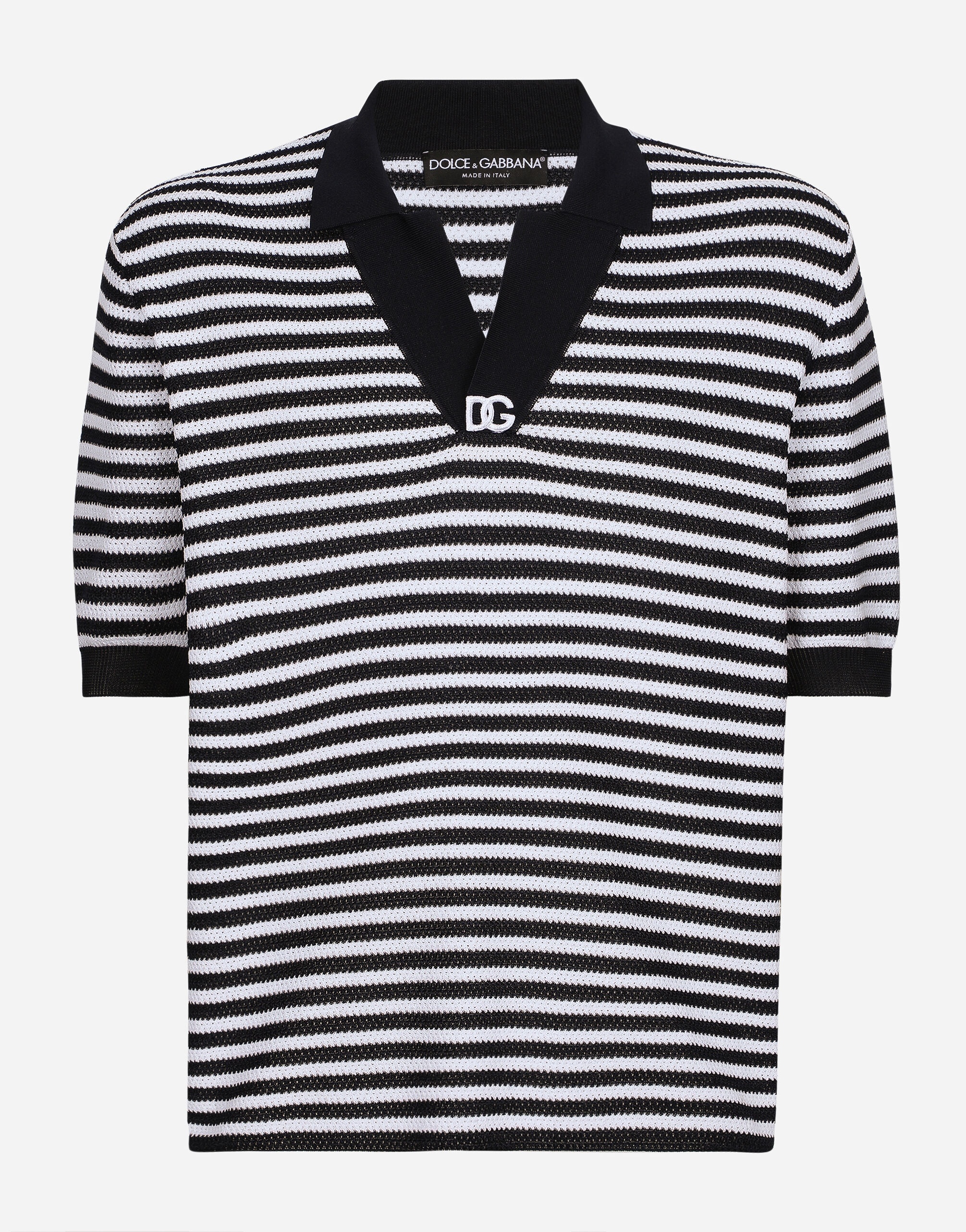 The Marina line has us dreaming of the Mediterranean sea and its myriad shades of blue, while also bringing weathered sailors to mind, yet with a contemporary edge. Aesthetic influences and clear lines, stormy sea Blue jackets, multi-pocket pieces, waterproof garments, anchor prints and materials that invite us to discover the “lighthouse keeper”. Fascinating, enigmatic and at times lonely, it tells the tale of a new masculine sensuality built with small yet precise proportions and attention to stylish detail. Striped cotton V-neck polo-shirt with DG logo: • Blue and white • Regular fit • Short sleeves • Fine-rib sleeve trims and neck • The piece measures 69 cm from the shoulder seam on a size IT 48 • Made in Italy External composition: 54% Cotton 46% Viscose
