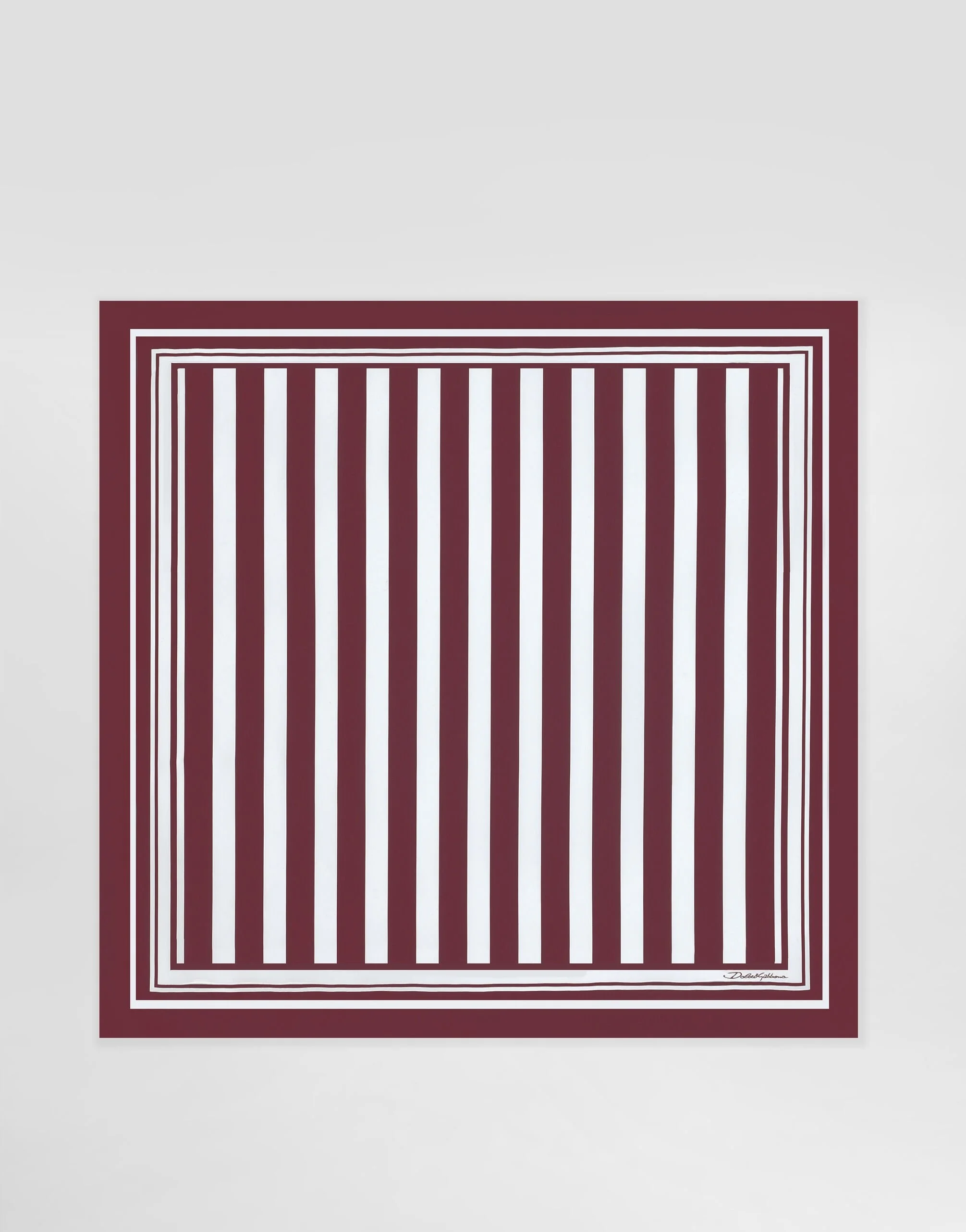 Italy and its beauty are reflected in the Men’s SS25 Collection. Woven raffia and leather give life to jackets, polo-shirts and sweaters to celebrating Italian craftsmanship. The color palette ranges from Nero Sicilia black to burgundy, contributing to conveying a sense of eternal elegance. Refined accessories complement the look: belts and loafers with hand-finished details and oversize bags, such as the Sicily, the Marlene with crocodile-effect print and the versatile Adamo tote. Striped-print silk twill foulard: • Burgundy and White • Measurements: 70 x 70 cm • Made in Italy External composition: 100% Silk