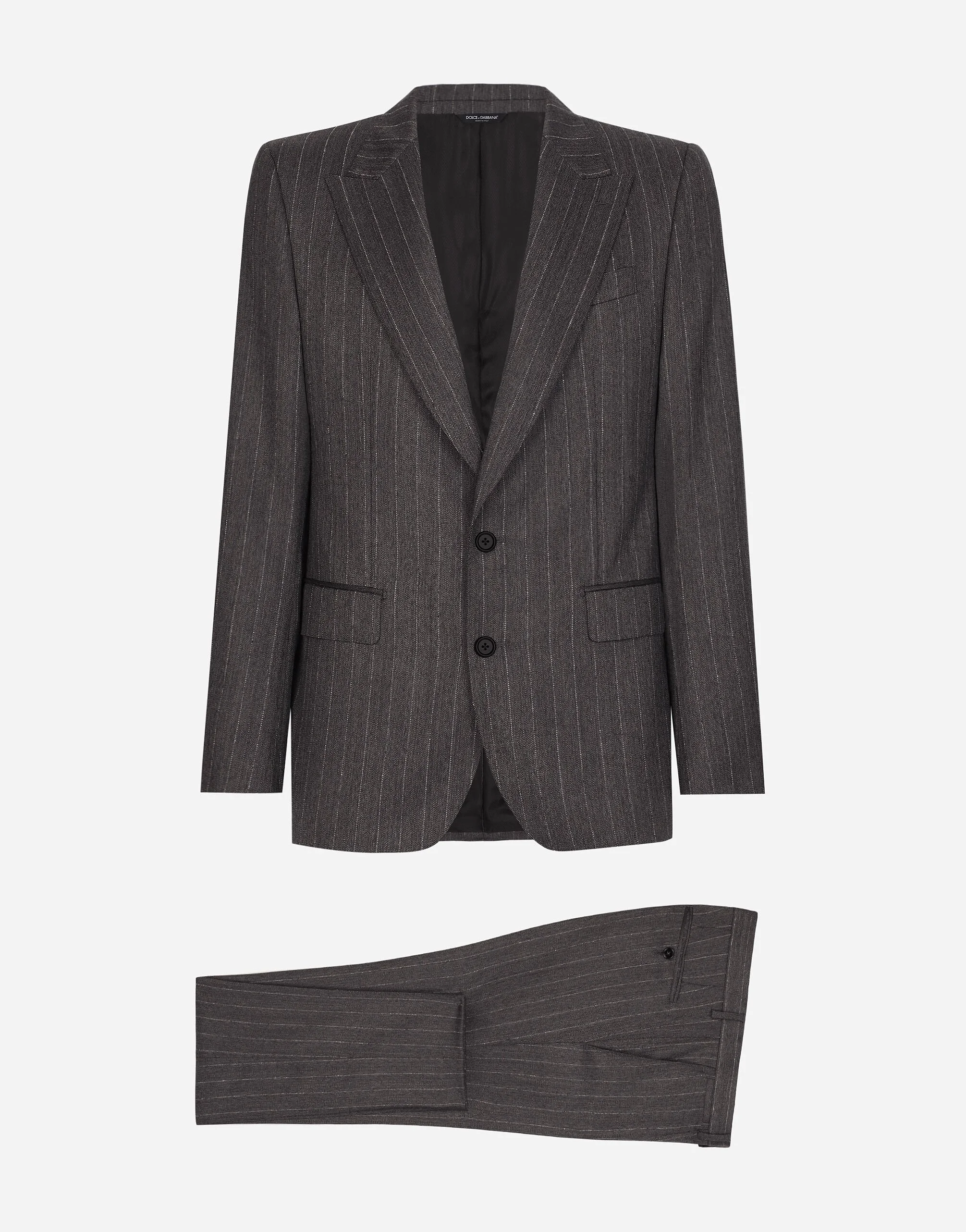 Tailoring means beauty, proportions, skilled cuts and sophisticated details. The FW 24-25 Sartoriale Collection builds on this solid foundation to define new ways of pairing colors, materials and textures. Sicilian rock gray envelops different textures, while Nero Sicilia black adorns textile and velvet weaves and camel pairs with orange. Various types of pinstripes, textured-effect cashmere, double fabrics, suede and denim meet in the looks. Tailored two-piece suit in pinstripe stretch wool: • Multi-colored • Slim Sicilia fit • Jacket with peak lapels, flap pockets and breast pocket, inner pockets and central vent • Single-breasted fastening with two buttons • Lined • Pants with front slant pockets and rear buttoned welt pockets • The jacket measures 73.5 cm from the back collar seam on a size IT 48 • The pants measure 115 cm on the outer leg and the hem is 17.5 cm wide on a size IT 48 • Made in Italy External composition: 100% Virgin Wool Internal composition: 100% Viscose