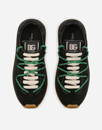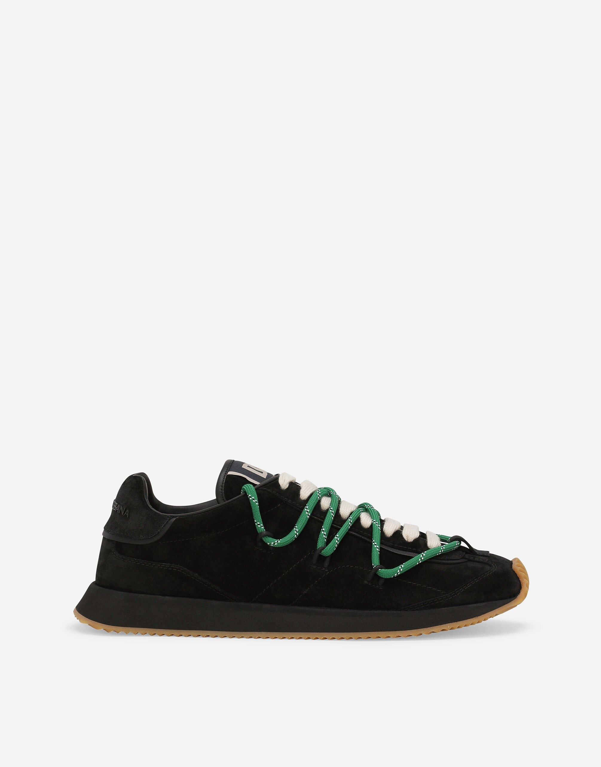 Featuring an ultra-light upper, the new DG Runner sneakers come in suede with calfskin details. Bold and contemporary, they are customized with two pairs of laces. Suede DG Runner sneakers: • Black • Heel cup with micro-injected Dolce&Gabbana logo detail • Flat laces and tubular laces • Tongue with DG logo • Calfskin footbed with branded label • Rubber bottom assembly and branded sole • Item comes with a branded dust bag • Made in Italy External composition: 56% Calfskin 44% Lambskin Internal composition: 92% Lambskin 8% Goatskin