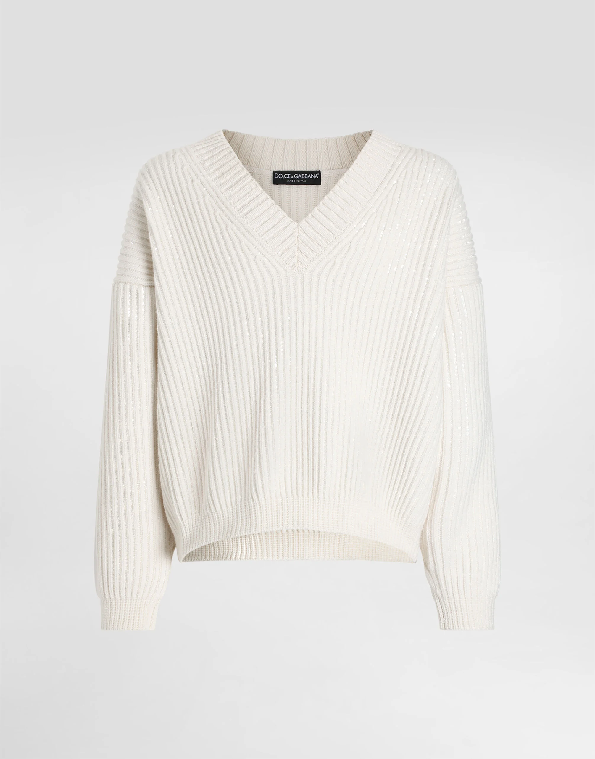 An elegant and refined pullover, perfect for adding a precious touch to your daily wardrobe. This garment offers a comfortable fit and timeless style. Sweater with sequins: • White • Oversized fit • V-neck • Long sleeves • The model is 185 cm tall and wears a size 48 IT • Made in Italy External Composition: 100% Virgin Wool