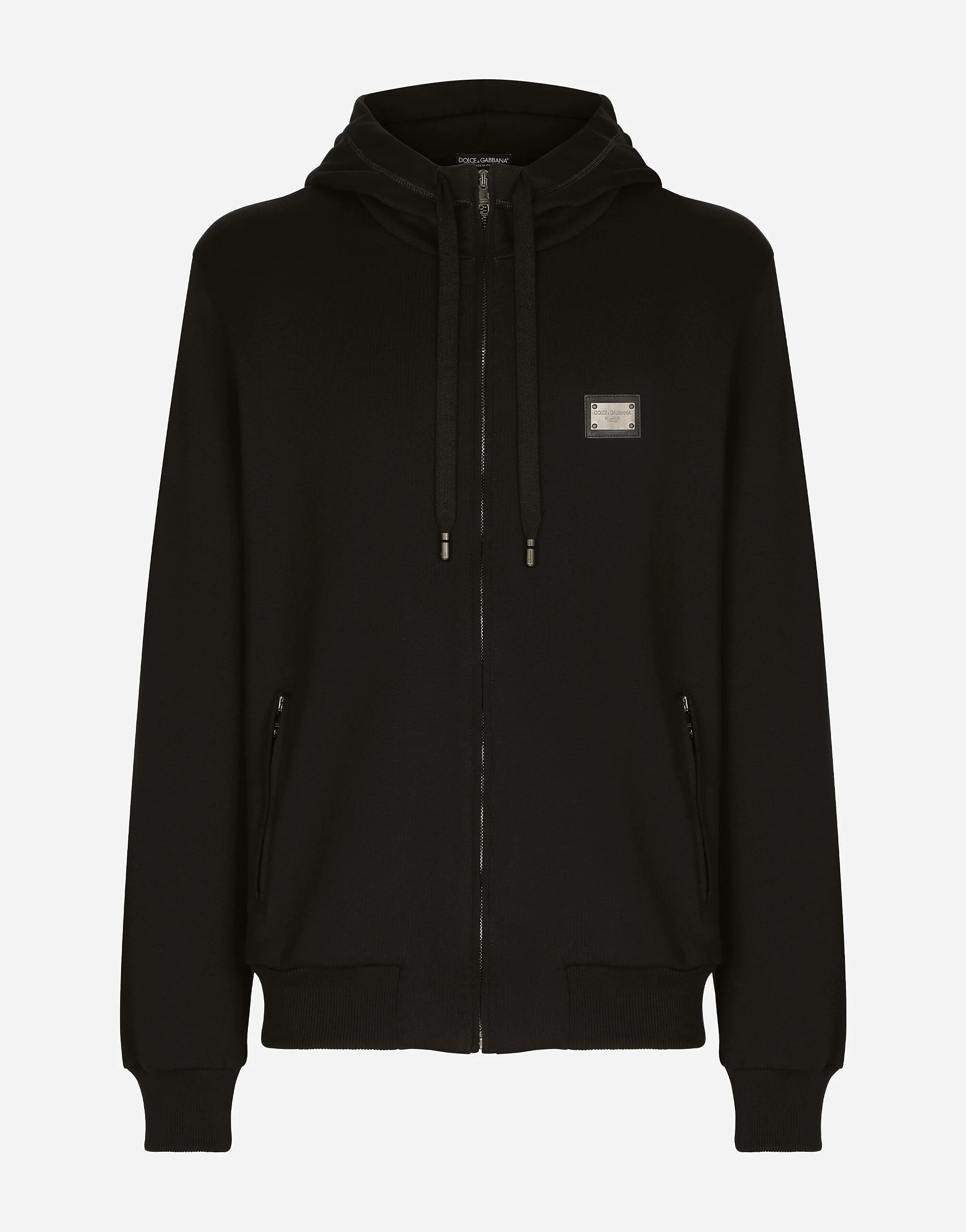 Cotton jersey hoodie with metal tag featuring the Dolce&Gabbana logo: • Regular fit • Zipper fastening • Drawstring hood with branded metal aglets • Zipped welt pockets • Stretch knit hem and cuffs • The piece measures 70 cm from the rear collar seam on a size IT 48 • The model is 185 cm tall and wears a size IT 48 • Made in Italy Care And Details External composition: 100% Cotton