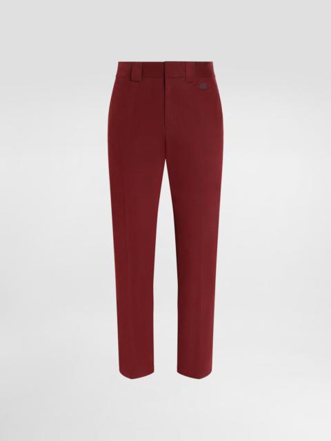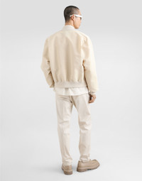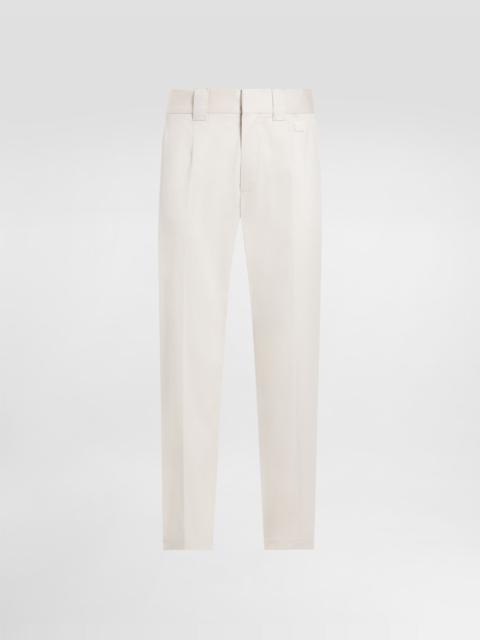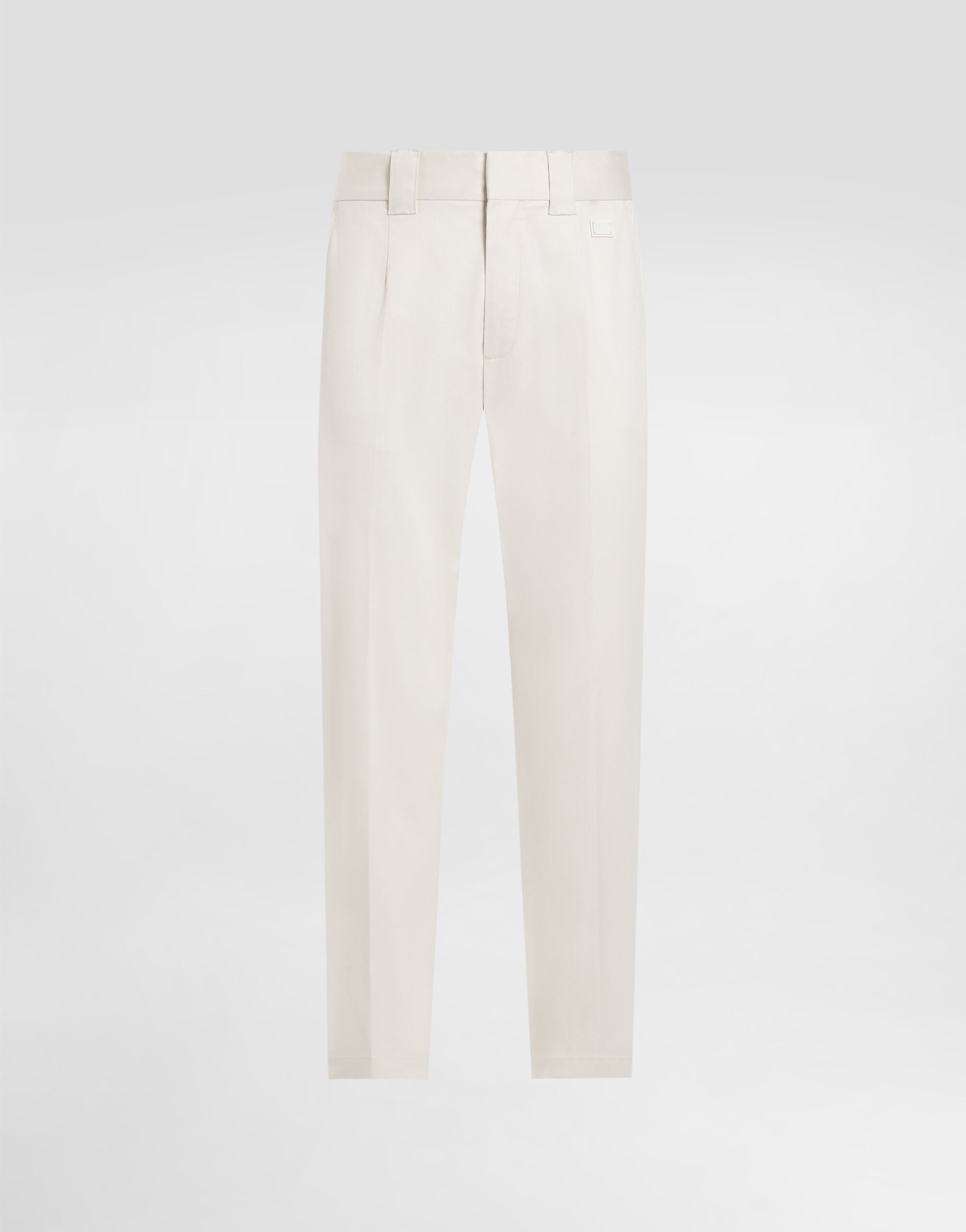 The DNA Men's Collection reimagines daily wear with bold contrasts, meticulous details, and innovative silhouettes. Outerwear stands out with clean lines and high-tech materials, merging sportiness with sophistication in sweaters, sweatshirts, and trousers. A striking color palette, including Black Sicily, caramel, cream, burgundy, and stone gray, pairs with iconic prints like Leopard and Polka dots, enhancing the collection's authentic and refined look. Tailored stretch cotton gabardine pants: • Beige • Regular fit • Belt loops on the waist • Fly-covered zipper and button fastening • Front slant pockets and buttoned welt pockets at the back • The item measures 105 cm on the outer leg and the hem is 22 cm wide on a size IT 48 • Made in Italy External composition: 98% Cotton 2% Spandex