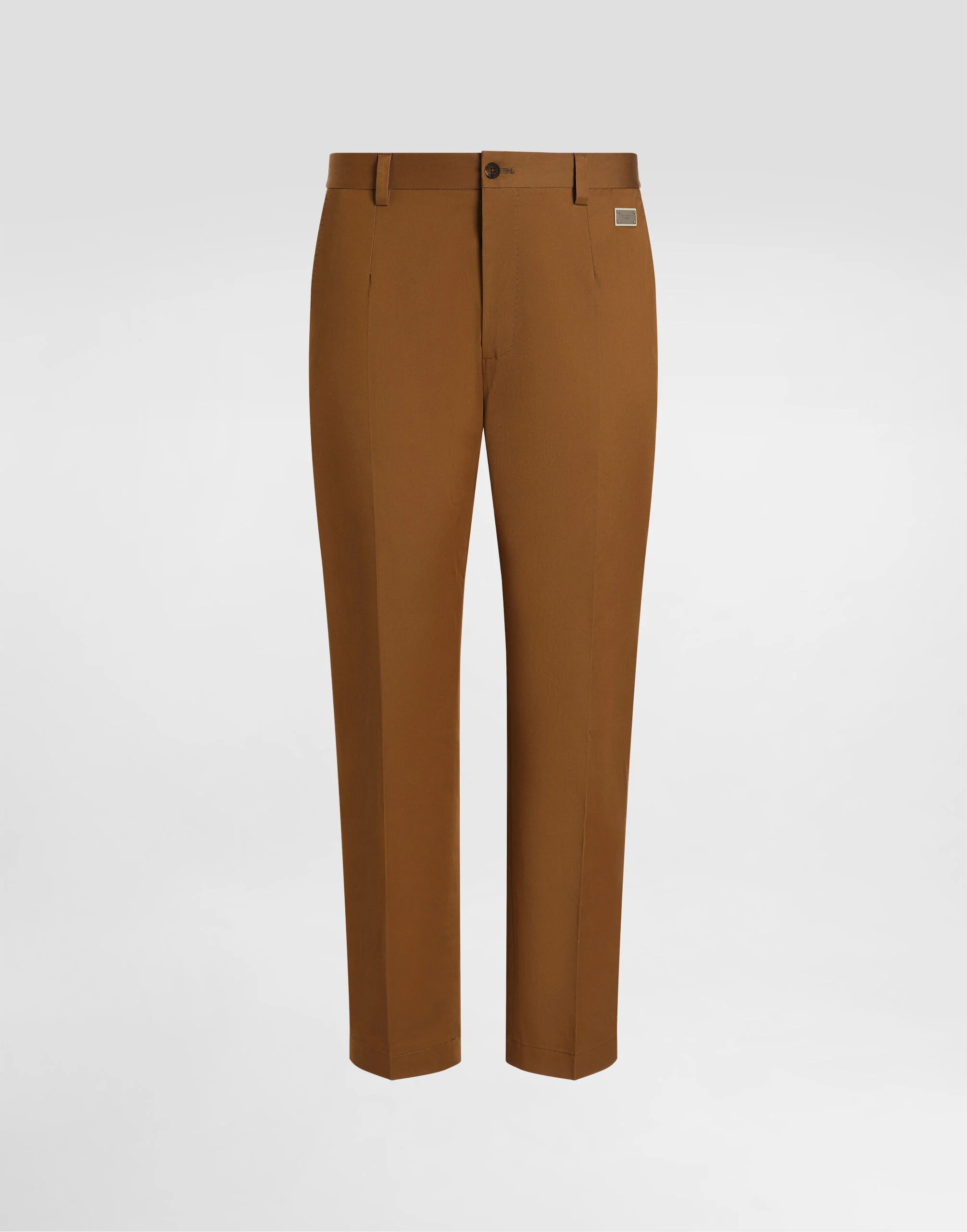 The DNA Men's Collection reimagines daily wear with bold contrasts, meticulous details, and innovative silhouettes. Outerwear stands out with clean lines and high-tech materials, merging sportiness with sophistication in sweaters, sweatshirts, and trousers. A striking color palette, including Black Sicily, caramel, cream, burgundy, and stone gray, pairs with iconic prints like Leopard and Polka dots, enhancing the collection's authentic and refined look. Tailored stretch cotton gabardine pants: • Brown • Regular fit • Belt loops on the front of the waist and elasticated rear waistband • Fly-covered zipper and button fastening • Front slant pockets and buttoned welt pockets at the back • The item measures 105 cm on the outer leg and the hem is 22 cm wide on a size IT 48 • Made in Italy External composition: 98% Cotton 2% Spandex