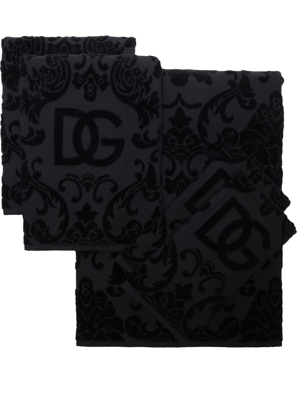 terry cotton towels (set of five) Dolce & Gabbana's black cotton towel set is ornately decorated with the brand's monogram and iconic Barocco motifs. It comprises five pieces of different sizes. Highlights - Black - Cotton - Signature barocco print - Jacquard logo motif - Towelling finish - Set of five Made in Italy Composition Cotton 100% Washing instructions Machine Wash