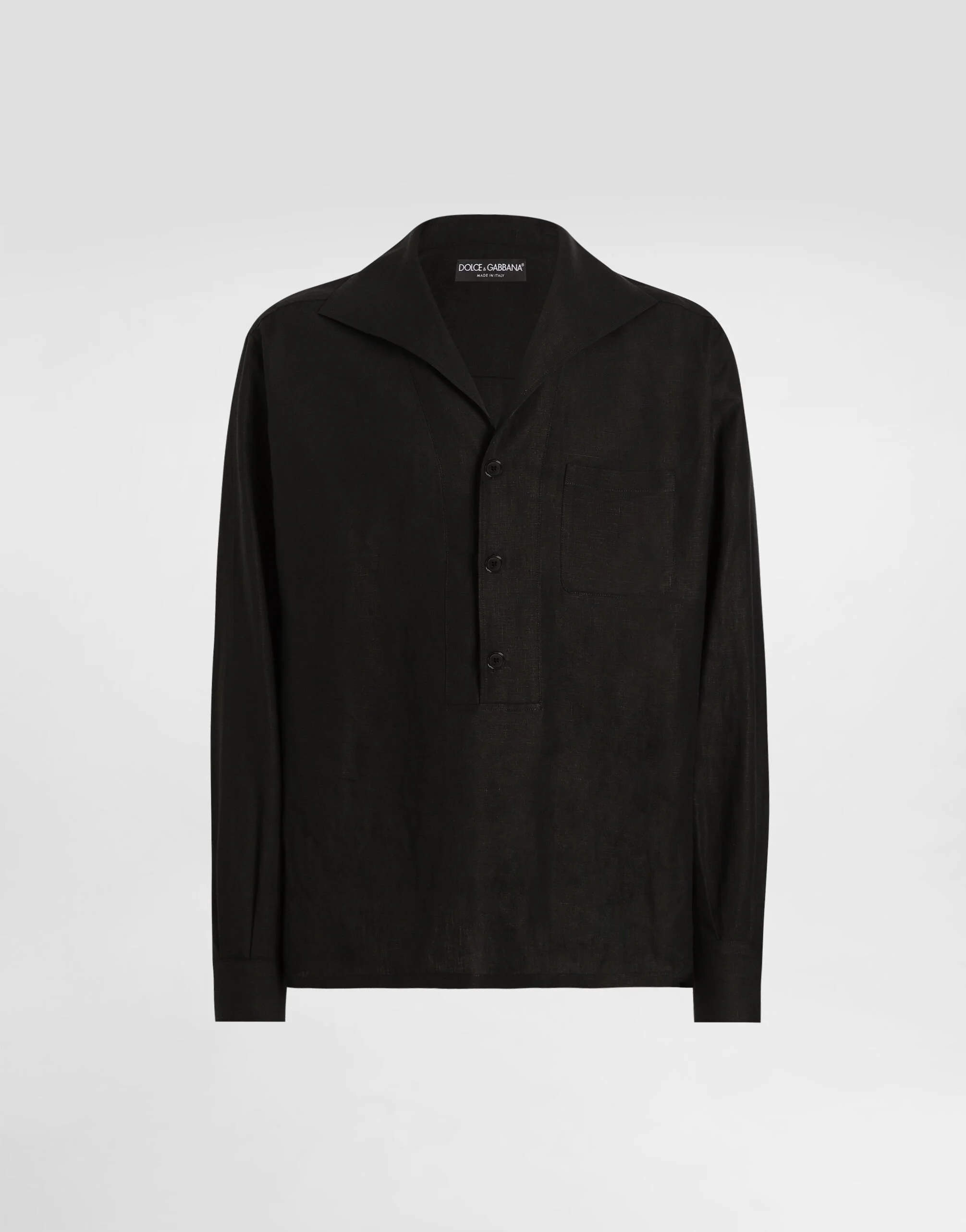 Italy and its beauty are reflected in the Men’s SS25 Collection. Woven raffia and leather give life to jackets, polo-shirts and sweaters to celebrating Italian craftsmanship. The color palette ranges from Nero Sicilia black to burgundy, contributing to conveying a sense of eternal elegance. Refined accessories complement the look: belts and loafers with hand-finished details and oversize bags, such as the Sicily, the Marlene with crocodile-effect print and the versatile Adamo tote. Three-button long-sleeved linen shirt: • Black • Oversize fit • Long sleeves • Patch breast pocket • Button fastenings • The piece measures 74 cm from the rear collar seam on a size IT 40 • Made in Italy External composition: 100% Linen