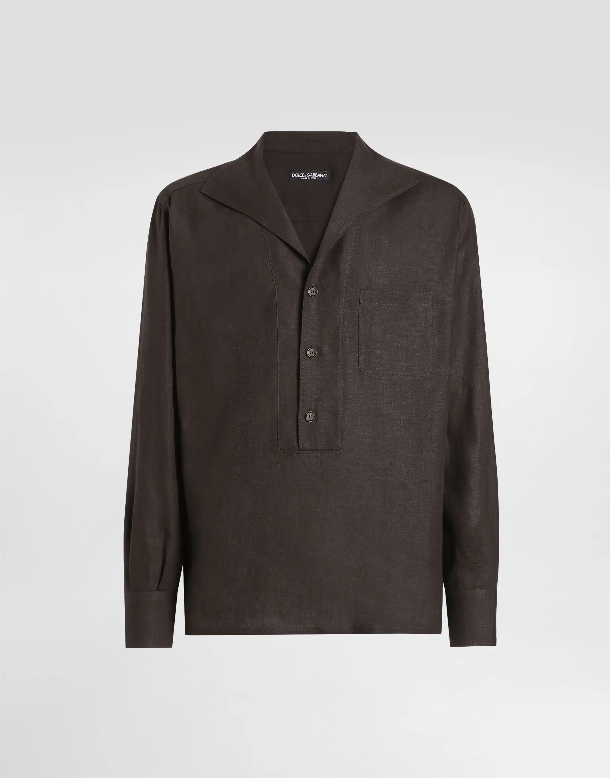 Italy and its beauty are reflected in the Men’s SS25 Collection. Woven raffia and leather give life to jackets, polo-shirts and sweaters to celebrating Italian craftsmanship. The color palette ranges from Nero Sicilia black to burgundy, contributing to conveying a sense of eternal elegance. Refined accessories complement the look: belts and loafers with hand-finished details and oversize bags, such as the Sicily, the Marlene with crocodile-effect print and the versatile Adamo tote. Three-button long-sleeved linen shirt: • Brown • Oversize fit • Long sleeves • Patch breast pocket • Button fastenings • The piece measures 74 cm from the rear collar seam on a size IT 40 • Made in Italy External composition: 100% Linen