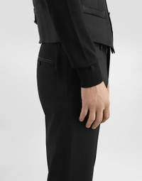 Elegant tailored three-piece stretch wool tuxedo suit with silk satin details: • Slim Sicilia fit • Jacket with peak lapels, welt pockets, a breast pocket, three inner pockets and central vent • Single-breasted fastening with a double button, lined • V-neck vest with five buttons • Pants with front slant pockets, rear buttoned welt pockets and satin side bands • The jacket measures 73.5 cm from the back collar seam on a size IT 48 • The pants measure 115 cm on the outer leg and the hem is 17.5 cm wide on a size IT 48 • The model is 185 cm tall and wears a size IT 48 • Made in Italy Care And Details External composition: 88% Wool 7% Silk 3% Spandex 2% Polyester Internal composition: 100% Viscose