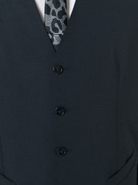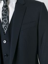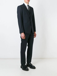 three piece suit Blue stretch wool three piece suit from Dolce & Gabbana featuring a jacket with notched lapels, a broad welt chest pocket, a front button fastening, front flap pockets, long sleeves, button cuffs and a rear central vent. The waistcoat features a v-neck, a sleeveless design and front welt pockets. The trousers feature a waistband with belt loops, a concealed front fastening, two inset pockets to the sides, two back buttoned welt pockets and a straight leg. Made in Italy Composition Outer: Wool 97%, Spandex/Elastane 3% Lining: Viscose 70%, Cupro 30% SIZE & FIT Model measurements Height 6 ft 2 in(1.87 m) Bust/Chest 37.79 in(96 cm) Hips 37.79 in(96 cm) Waist 30.31 in(77 cm) Washing instructions Dry Clean Only