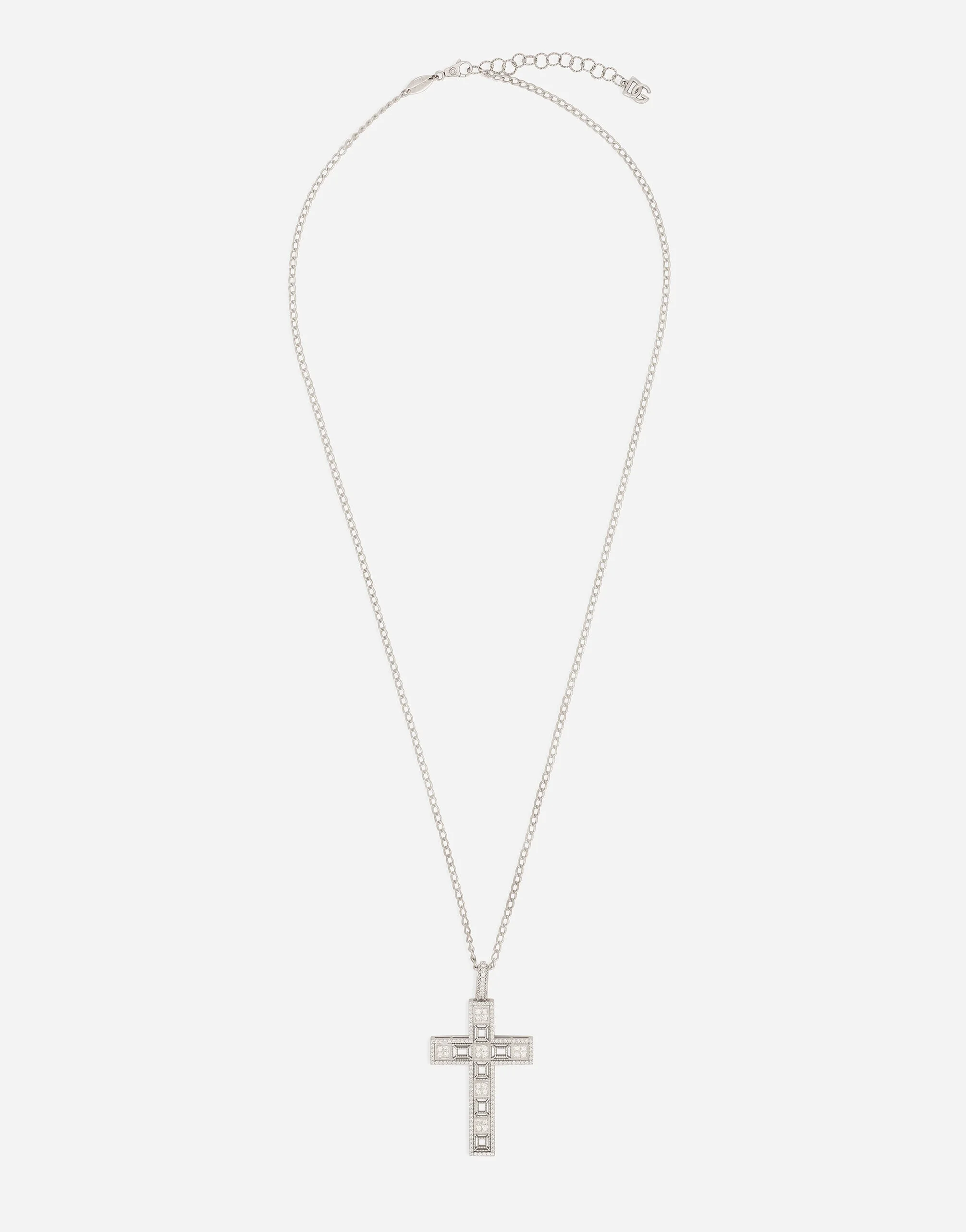 Cross pendant in white gold with diamonds. Technical specification: 18 Kt white gold Cross Measure: 4,5 cm Gemological details: 24 diamonds: transparent, colourless, square shape, princess cut total weight: 1.25 ct clarity: VVS – VS colour: D – G 128 diamonds: transparent, colourless, round shape, brilliant cut total weight: 0.76 ct clarity: VVS – VS colour: D – G. Made in Italy white gold