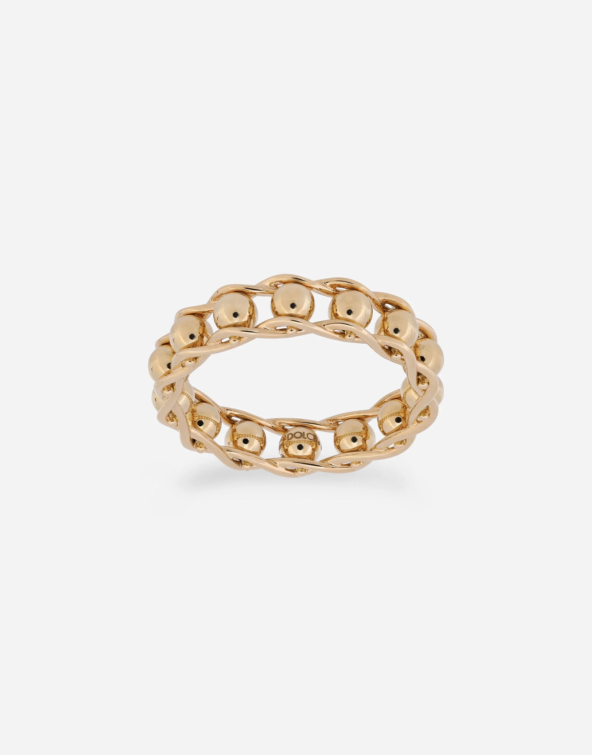 This yellow gold band ring is a twist on the classic chain of rosary beads. The ring is made up of fourteen beads in yellow gold, representing the spheres of the rosary. The flanks are composed by a twisted wire that allow the spheres to roll. The "DOLCE&GABBANA" logo is engraved on the yellow gold bead. Technical specifications: Gold 18 Kt. Made in Italy. Yellow 18 kt gold
