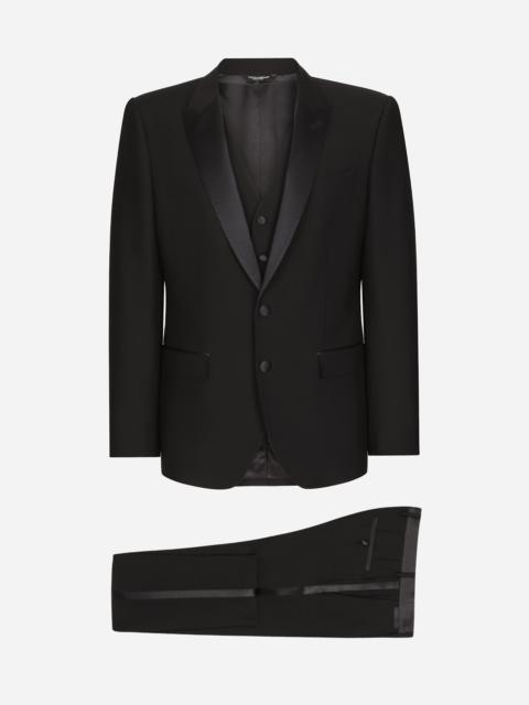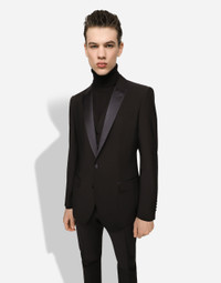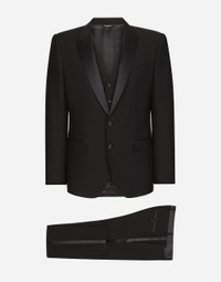 Tailored three-piece wool tuxedo suit with silk satin details: • Blue •Regular Martini fit •Jacket with peak lapels, flap pockets and breast pocket, two inner pockets and central vent •Single-breasted fastening with two buttons • Lined •V-neck vest with five buttons •Pants with front slant pockets, rear buttoned welt pockets and side bands •The jacket measures 73.5 cm from the back collar seam on a size IT 48 •The pants measure 115 cm on the outer leg and the hem is 17.5 cm wide on a size IT 48 •The model is 185 cm tall and wears a size IT 48 •Made in Italy Care And Details External composition: 87% Wool 10% Silk 3% Polyester Internal composition: 79% Viscose 13% Acetate 8% Cupro