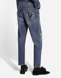Contemporary men’s formalwear: The FW 24/25 Dolce&Gabbana Men’s Collection is embracing the concept of absolute elegance dominated by the iconic Nero Sicilia black. The daywear of the Dolce&Gabbana man comes to life through the outerwear that comes in a range of lengths and the slim-fit pants. For nightwear, the look becomes scintillating thanks to sequined embellishment and stone appliques. This refined taste can also be seen on the accessories, such as on the slip-ons with hand-applied organza flower accent and the new clutch. Loose five-pocket jeans in stretch denim: • Blue • Regular fit • Fly-covered zipper and button fastening • DG embroidery on back pocket • The item measures 99 cm on the outer leg and the hem is 18 cm wide on a size IT 48 • The model is 185 cm tall and wears a size IT 48 • Made in Italy External composition: 100% Cotton