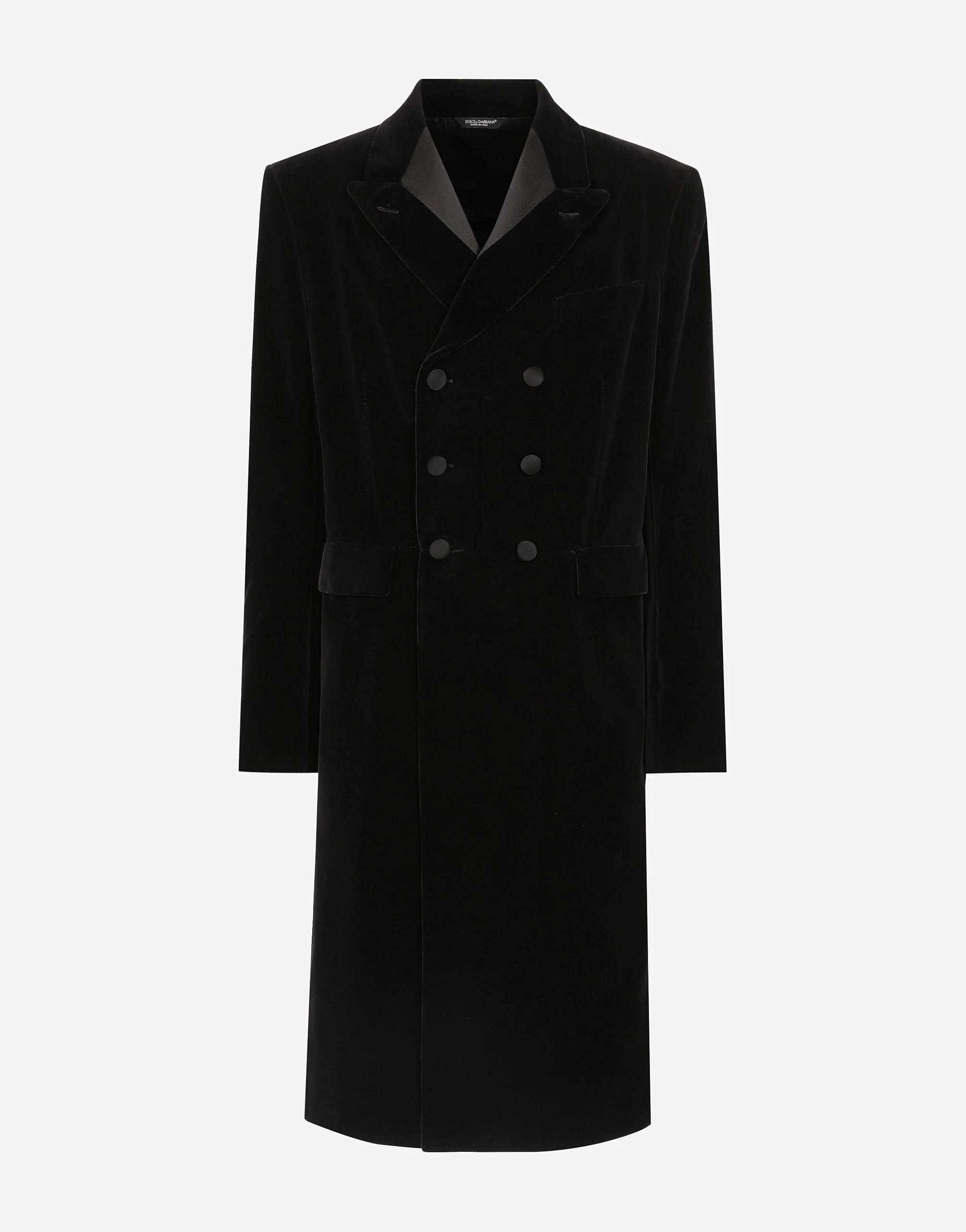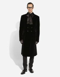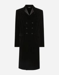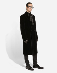 Contemporary men’s formalwear: The FW 24/25 Dolce&Gabbana Men’s Collection is embracing the concept of absolute elegance dominated by the iconic Nero Sicilia black. The daywear of the Dolce&Gabbana man comes to life through the outerwear that comes in a range of lengths and the slim-fit pants. For nightwear, the look becomes scintillating thanks to sequined embellishment and stone appliques. This refined taste can also be seen on the accessories, such as on the slip-ons with hand-applied organza flower accent and the new clutch. Smooth cotton velvet coat with inlaid frock coat cut and satin details: • Black • Regular fit • Double-breasted fastening with buttons • Lined • Deep vent on the back • The piece measures 117 cm from the rear collar seam on a size IT 48 • Made in Italy External composition: 91% Cotton 5% Silk 3% Virgin Wool 1% Polyester Internal Composition: 100% Silk