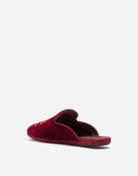 Dolce & Gabbana Men's formal footwear stands out for its craftsmanship, the meticulous selection of leathers used and its attention to detail. Velvet Young Pope mules with coat of arms embroidery: • Velvet upper with gros-grain trims featuring coat of arms embroidery • Sole with fresa bombé and burgundy leather bottom assembly with debossed italic logo • Burgundy quilted satin insole and branded label • Made in Italy Care And Details External composition: 100% Cotton Internal composition: 70% Sheepskin 5% Sheepskin 3% Rayon 2% Cotton 2% Silk