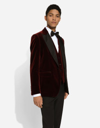 Tailoring means beauty, proportions, skilled cuts and sophisticated details. The FW 24-25 Sartoriale Collection builds on this solid foundation to define new ways of pairing colors, materials and textures. Sicilian rock gray envelops different textures, while Nero Sicilia black adorns textile and velvet weaves and camel pairs with orange. Various types of pinstripes, textured-effect cashmere, double fabrics, suede and denim meet in the looks. Tailored deconstructed velvet single-breasted tuxedo jacket: • Burgundy • Regular fit • Peak lapels • Button fastening at the front • Outer flap pockets and breast pocket, and inner welt pockets with button • Covered buttons on the cuffs • Central vent • Lined • The piece measures 73.5 cm from the rear collar seam on a size IT 48 • Made in Italy External composition: 81% Cotton 15% Silk 4% Polyester Internal composition: 100% Silk