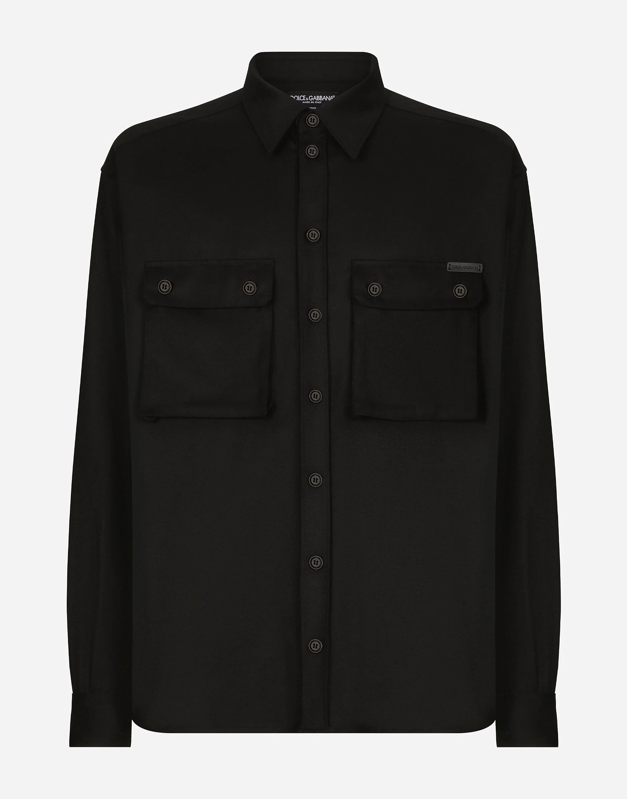 Tailoring means beauty, proportions, skilled cuts and sophisticated details. The FW 24-25 Sartoriale Collection builds on this solid foundation to define new ways of pairing colors, materials and textures. Sicilian rock gray envelops different textures, while Nero Sicilia black adorns textile and velvet weaves and camel pairs with orange. Various types of pinstripes, textured-effect cashmere, double fabrics, suede and denim meet in the looks. Oversize wool flannel shirt: • Black • Oversize fit • Kent collar •Bellow breast pockets with flap • Button fastenings • Long sleeves • Back yoke with darts • The piece measures 79 cm from the rear collar seam on a size IT 40 • Made in Italy External composition: 100% Virgin Wool