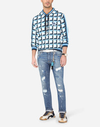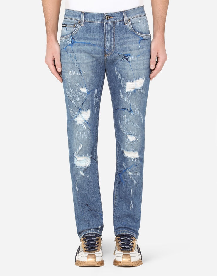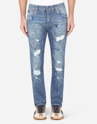 The wonderful colors of the sea and the geometric designs of the majolicas, mixed with the white and blue of the linen, are the key details of the “Parco dei Principi” collection. Tailored garments in light fabrics, such as twill, linen and poplin, enhance the elegance of the Dolce&Gabbana man throughout the entire day. Five-pocket skinny jeans in washed blue stretch denim with repaired rips and colorful brushstrokes: • Slim fit • Concealed zipper and button fastening • DG patch on the back pocket • The crotch measures 14 cm - 5.5 inches from the center back of the waistband and the hem is 16.5 cm - 6.5 inches wide on a size IT 48 • The item measures 105 cm - 41.3 inches on the outer leg on a size IT 48 • The model is 185 cm - 72.8 inches tall and wears a size IT 48 • Made in Italy Care And Details External composition: 98% Cotton 2% Spandex