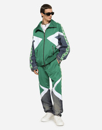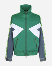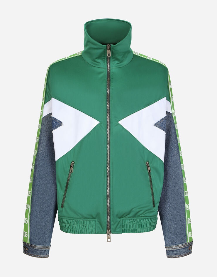 High-necked patchwork jacket in light wash denim and technical jersey with the metal Dolce&Gabbana logo tag and jacquard DG Monogram bands: • Oversize fit • Front zipper fastening • Inner and outer welt pockets with zipper • Mesh lining • The piece measures 68.5 cm from the rear collar seam on a size M • The model is 185 cm tall and wears a size M • Made in Italy Care And Details External composition: 60% Polyester 40% Cotton Lining: 50% Polyamide 50% Polyester