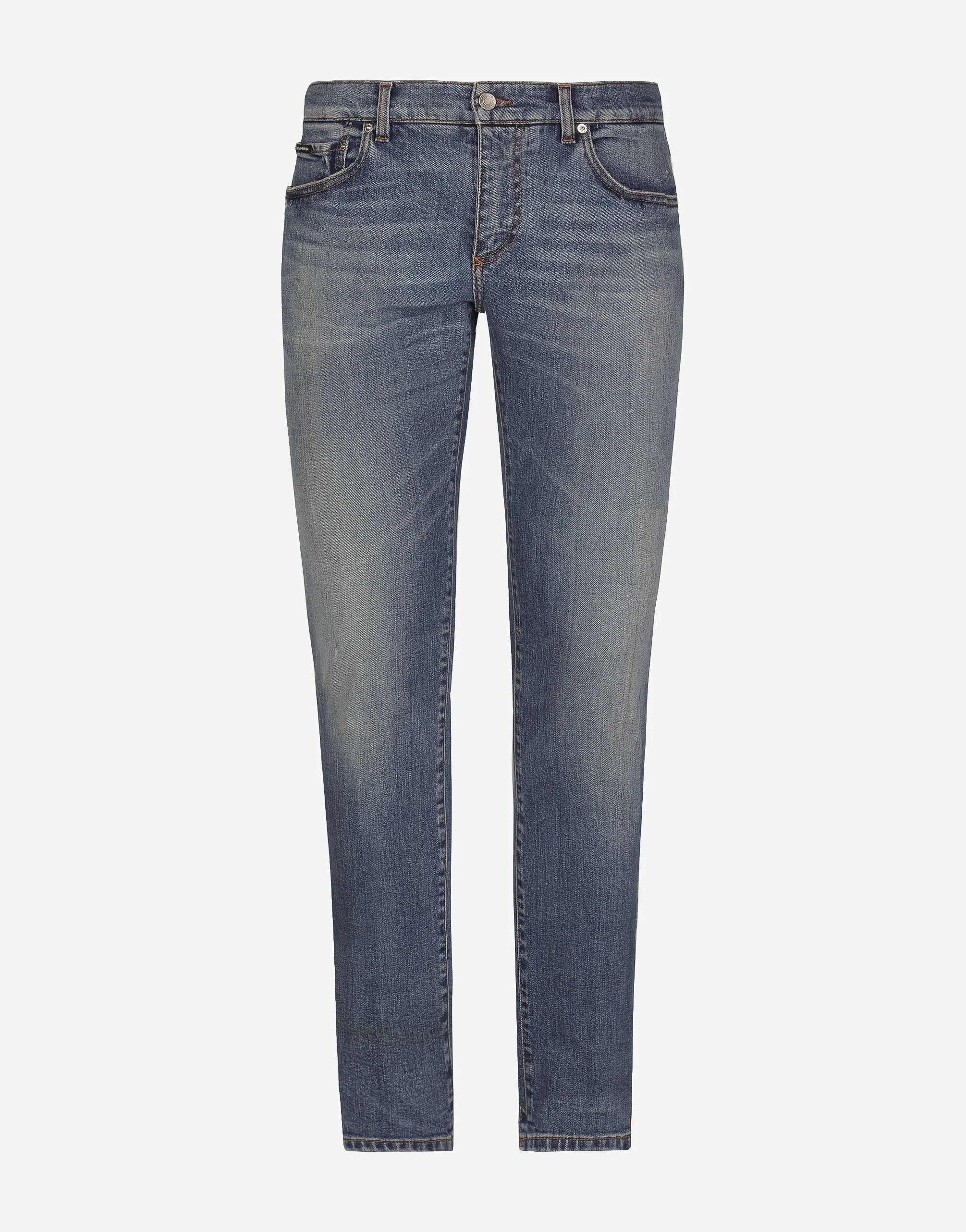 Five-pocket skinny jeans in stretch denim with whiskering: • Blue • Slim fit • Fly-covered zipper and button fastening • Metal Dolce&Gabbana logo tag on the back • The item measures 105 cm on the outer leg and the hem is 17 cm wide on a size IT 48 • The model is 185 cm tall and wears a size IT 48 • Made in Italy Care And Details External composition: 98% Cotton 2% Spandex