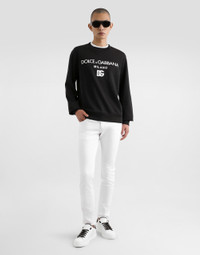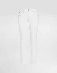 Five-pocket regular jeans in stretch denim: • White •Regular fit •Fly-covered zipper and button fastening •Metal Dolce&Gabbana logo plate on the back •The item measures 105 cm on the outer leg and the hem is 17 cm wide on a size IT 48 •The model is 185 cm tall and wears a size IT 48 •Made in Italy Care And Details External composition: 98% Cotton 2% Spandex