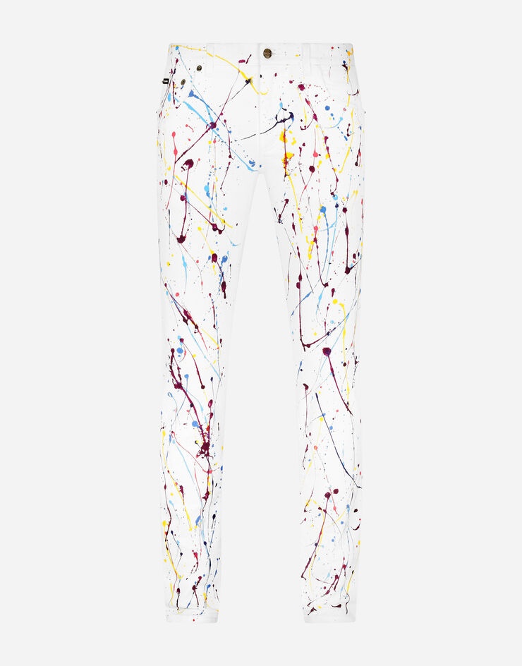 The “DG Light Therapy” fashion show is a tribute to life itself, positivity and folklore. Distinctive luminaries become wonderful photographic prints to create special, iconic pieces when combined with embroidery, crystals, sequins and jacquard designs. Five-pocket skinny jeans in white stretch denim with color splash print: • Slim fit • Fly-covered zipper and button fastening • Metal Dolce&Gabbana logo plate on the back • The item measures 105 cm - 41.3 inches on the outer leg and the hem is 16.5 cm - 6.5 inches wide on a size IT 48 • The model is 185 cm - 72.8 inches tall and wears a size IT 48 • Made in Italy Care And Details External composition: 98% Cotton 2% Spandex