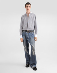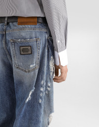 The Italian Holiday Men's Collection revisits 1950s style with a blend of relaxed fits and modern flair. Classic white shirts and tailored suits in refined fabrics contrast with casual denim and playful T-shirts featuring retro graphics with a futuristic twist. Bold prints—chessboards, cats, elegant lighters, and Mediterranean blue ribbons—alongside logo jacquard inspired by ties, infuse a contemporary edge into the essence of Italian holidays. Oversize five-pocket wide-leg cotton jeans with abrasions: • Blue • Loose fit • Fly-covered zipper and button fastening • Metal Dolce&Gabbana logo tag on the back • The item measures 115 cm on the outer leg and the hem is 26 cm wide on a size IT 48 • Made in Italy External composition: 100% Cotton