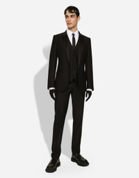 In the DNA Collection, Sicilian roots meet streetwear and urban becomes the indisputable star. New materials, such a printed reflective materials, technical jersey and canvas merge with iconic fabrics and new 3D logo techniques to create sporty, contemporary looks. Refined and tailored three-piece wool tuxedo suit with silk satin details. • Regular Martini fit • Jacket with peak lapels, welt pockets, a breast pocket, and three inner pockets • Single-breasted fastening with a double button, lined • V-neck vest with five buttons • Pants with front slant pockets, rear buttoned welt pockets and satin side bands • The jacket measures 73.5 cm - 28.9 inches from the back collar seam on a size IT 48 • The crotch measures 17.5 cm - 6.9 inches and the hem is 18 cm - 7.1 inches wide on a size IT 48 • The model is 185 cm - 72.8 inches tall and wears a size IT 48 • Made in Italy External composition: 87% Virgin Wool 10% Silk 3% Polyester Internal composition: 79% Viscose 13% Acetate 8% Cupro
