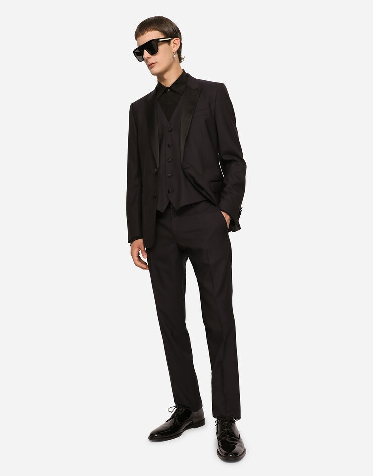 Tailored three-piece wool and silk tuxedo suit with silk duchesse details: • Regular Martini fit • Jacket with peak lapels, welt pockets, a breast pocket, three inner pockets and central vent • Single-breasted fastening with a double button, lined • V-neck vest with five buttons • Pants with front slant pockets, rear buttoned welt pockets and satin side bands • The jacket measures 73.5 cm from the back collar seam on a size IT 48 • The pants measure 115 cm on the outer leg and the hem is 17.5 cm wide on a size IT 48 • The model is 185 cm tall and wears a size IT 48 •Made in Italy Care And Details External composition: 67% Virgin Wool 30% Silk 3% Polyester Internal composition: 70% Silk 30% Viscose