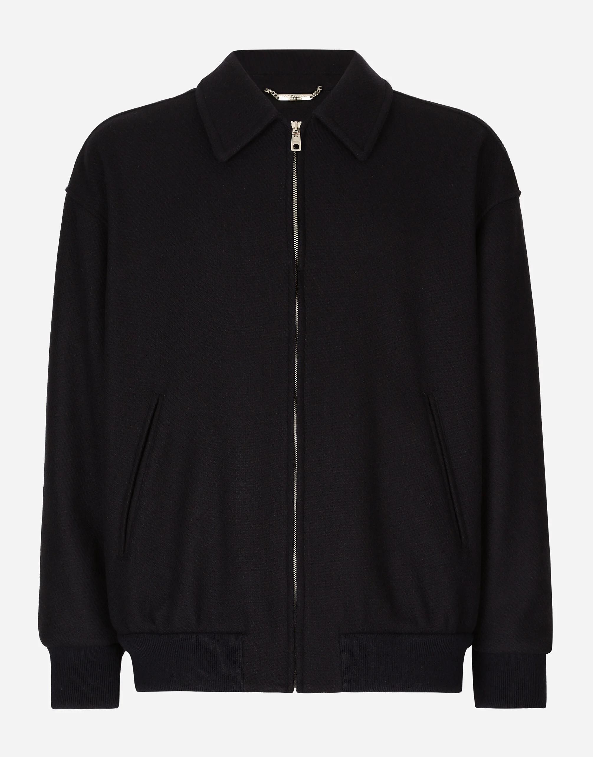 The Marina line has us dreaming of the Mediterranean sea and its myriad shades of blue, while also bringing weathered sailors to mind, yet with a contemporary edge. Aesthetic influences and clear lines, stormy sea blue jackets, multi-pocket pieces, waterproof garments, anchor prints and materials that invite us to discover the “lighthouse keeper”. Fascinating, enigmatic and at times lonely, it tells the tale of a new masculine sensuality built with small yet precise proportions and attention to stylish detail. Wool-blend bomber jacket with a metal tag featuring the Dolce&Gabbana logo: • Blue • Shirt collar • Front zipper fastening • Outer pockets with concealed press-stud fastenings • Unlined • The piece measures 66 cm from the rear collar seam on a size IT 50 • Made in Italy External composition: 80% Virgin Wool 20% Polyamide