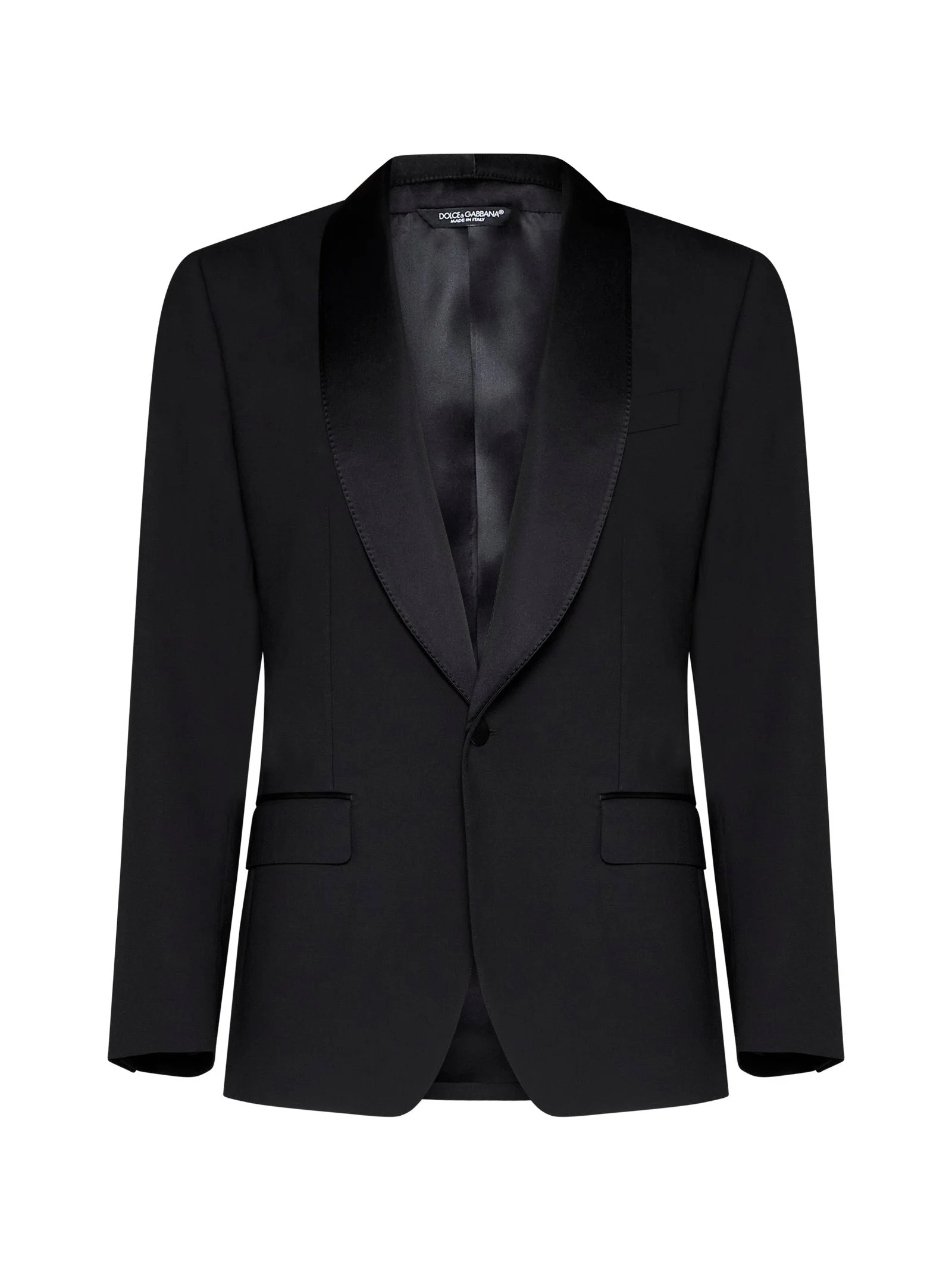 Dolce & Gabbana’s black tailored wool and silk blend lined single-breasted blazer featuring satin shawl lapel, chest pocket, flap pockets and center back vent. Color: Black Size and fit: Model is 195 cm tall and wearing a size IT 48 Composition: 82% virgin wool 13% silk 5% other fibers Country of manifacture: Italy ID designer: G2RS1TFUBF27RN0000