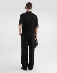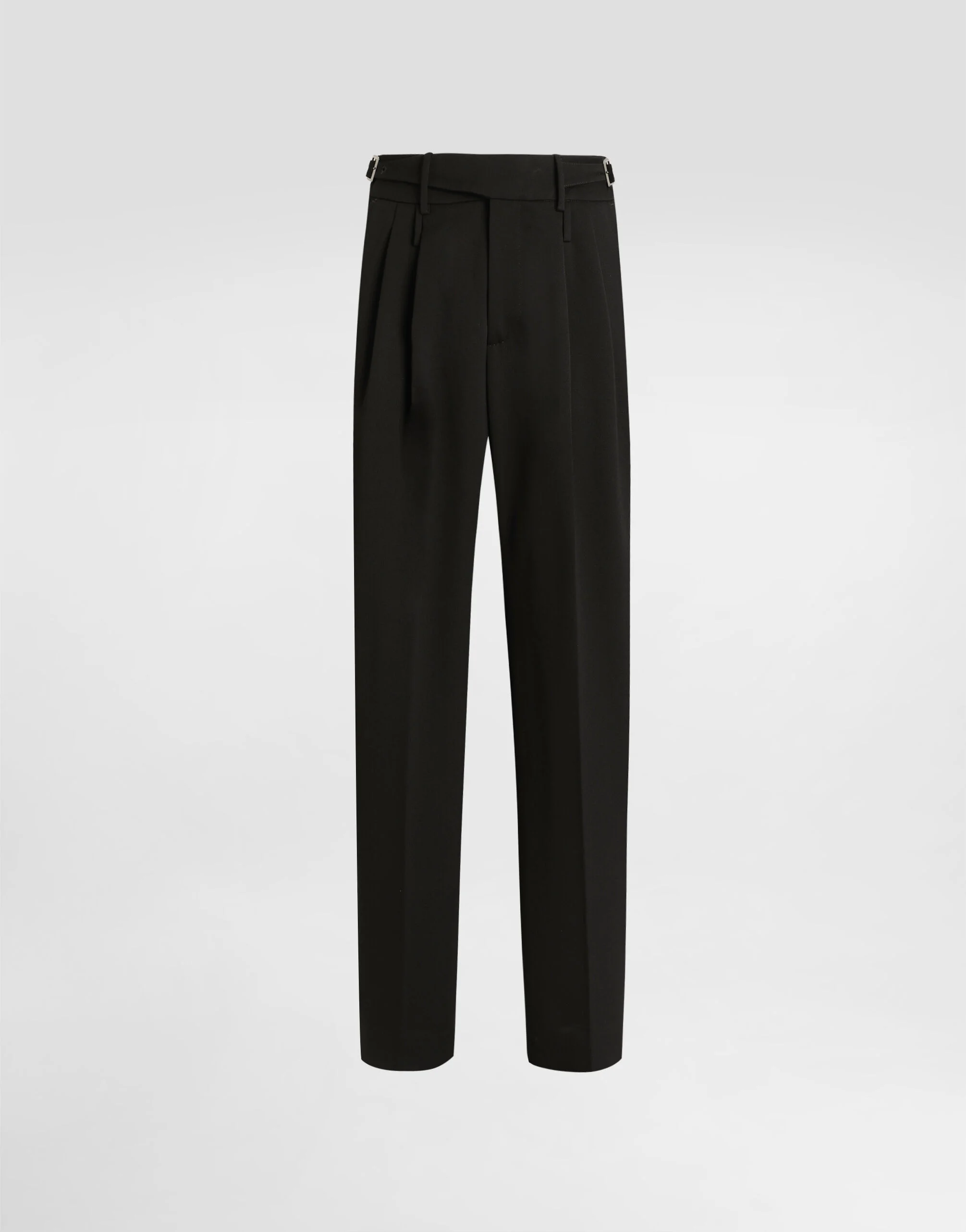 These tailored wool gabardine trousers are an essential piece for the modern man, combining elegance and comfort in a refined design. Wool gabardine trousers: • Black • With folds towards the center front • Wide hem • Inseam length 83.5 cm on size 48 IT • Leg opening 24 cm on size 48 IT • The model is 185 cm tall and wears a size 48 IT • Made in Italy External Composition: 100% Virgin Wool