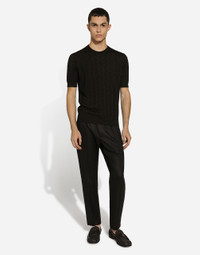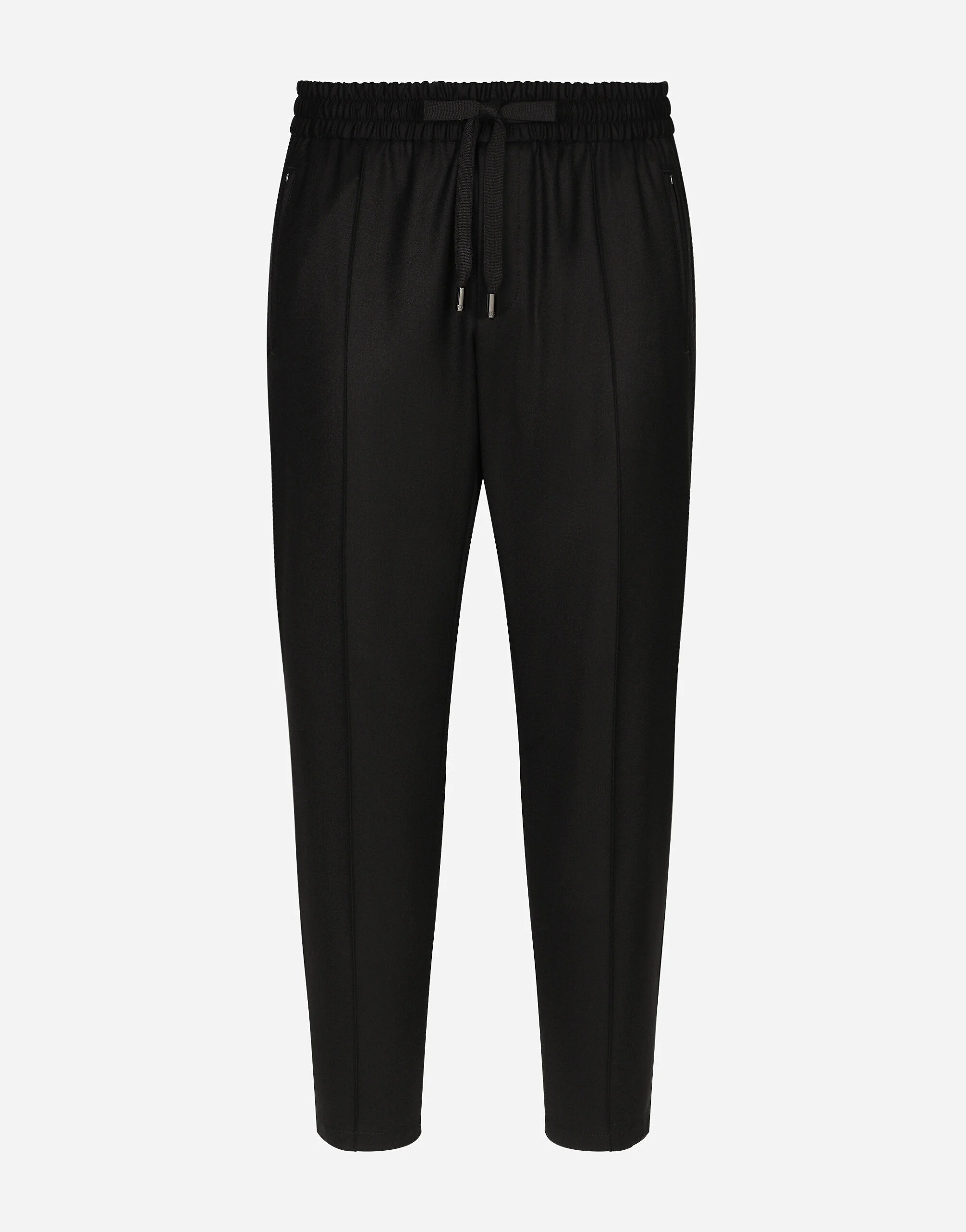 Tailoring means beauty, proportions, skilled cuts and sophisticated details. The FW 24-25 Sartoriale Collection builds on this solid foundation to define new ways of pairing colors, materials and textures. Sicilian rock gray envelops different textures, while Nero Sicilia black adorns textile and velvet weaves and camel pairs with orange. Various types of pinstripes, textured-effect cashmere, double fabrics, suede and denim meet in the looks. Wool jogging pants: • Black • Regular fit • Stretch waistband with drawstring • Front and back welt pockets with zipper • The item measures 99 cm on the outer leg and the hem is 17.5 cm wide on a size IT 48 • Made in Italy External composition: 100% Virgin Wool