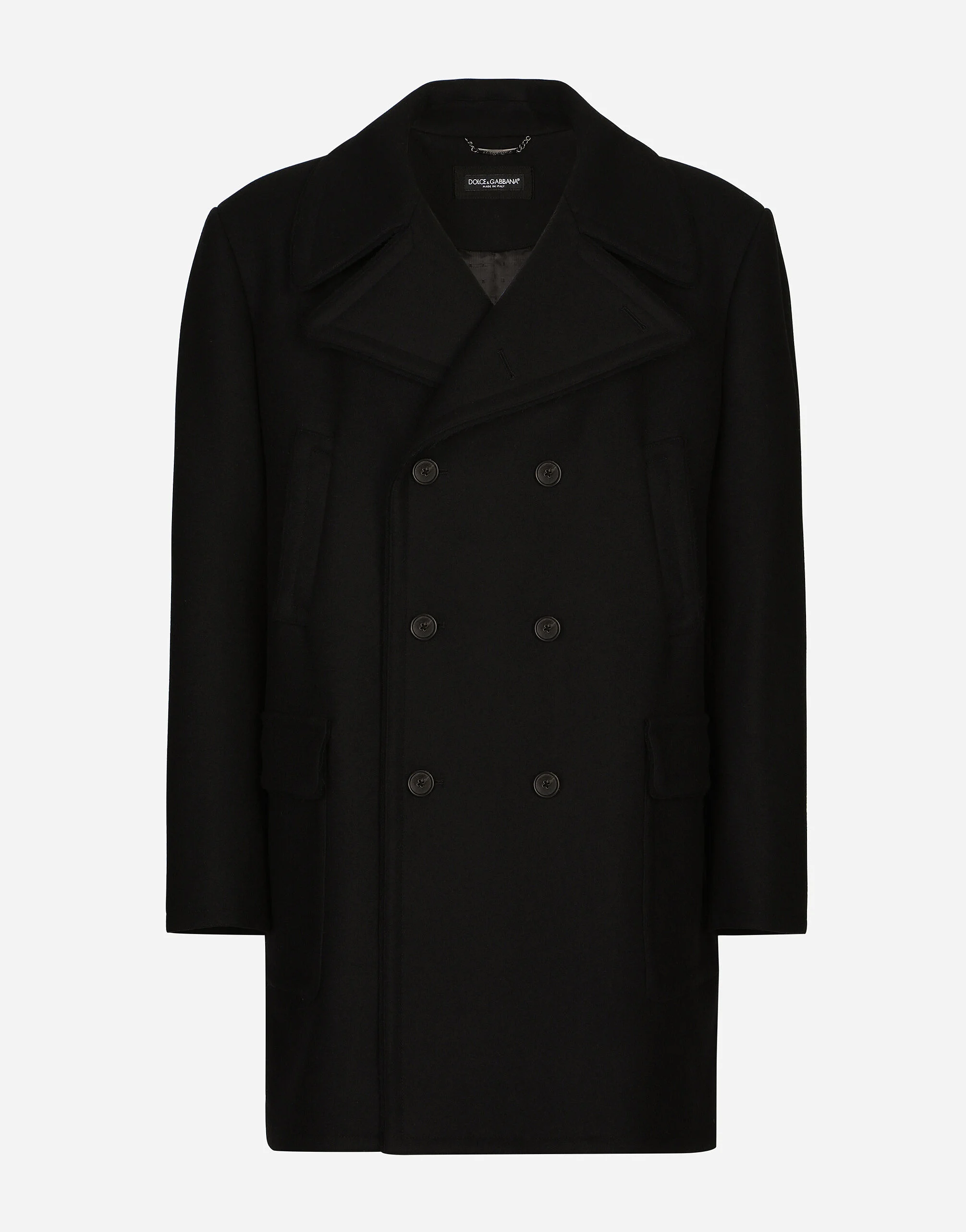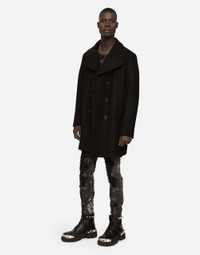 Double-breasted wool pea coat. • Light insulated padding on the interior • Regular fit • Mirrored lapels • Button fastenings • Outer patch and slanting pockets and zipped welt pockets on interior • Half-belt on the back with buttons • Lined • The piece measures 85 cm from the back collar seam on a size IT 48• The model is 185 cm tall and wears a size IT 48 • Made in Italy Care And Details External composition: 95% Virgin Wool 5% Polyamide Internal composition: 98% Viscose 2% Cotton
